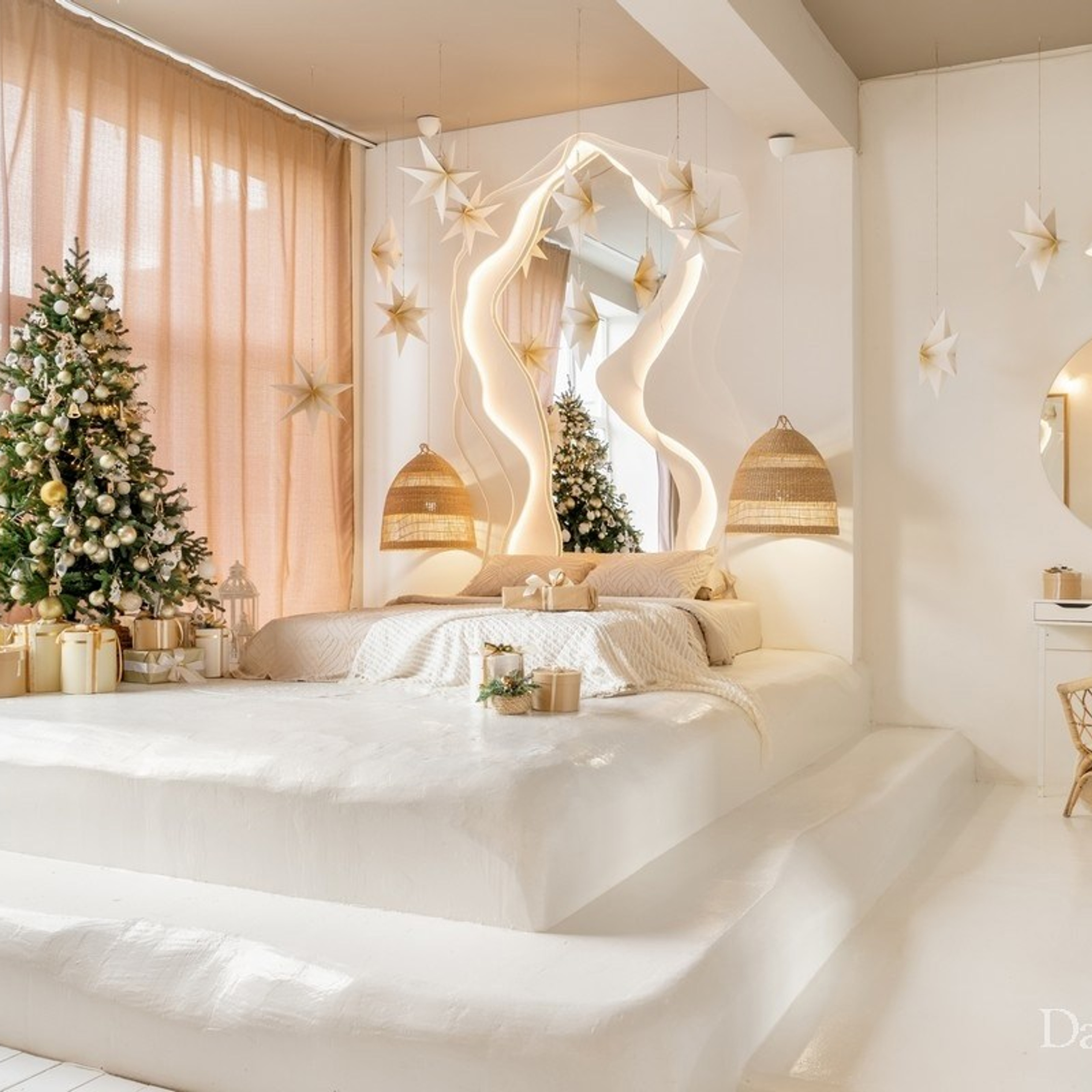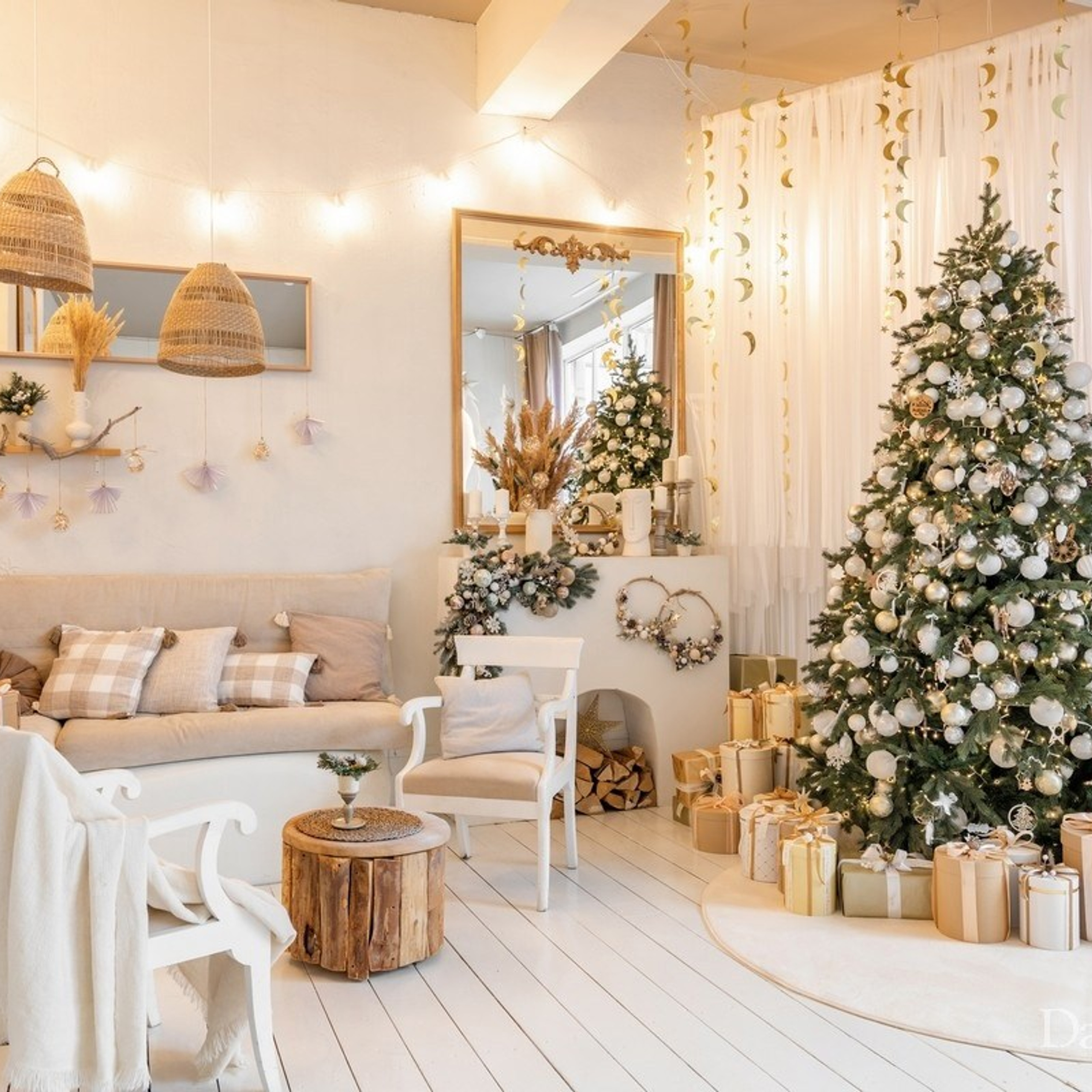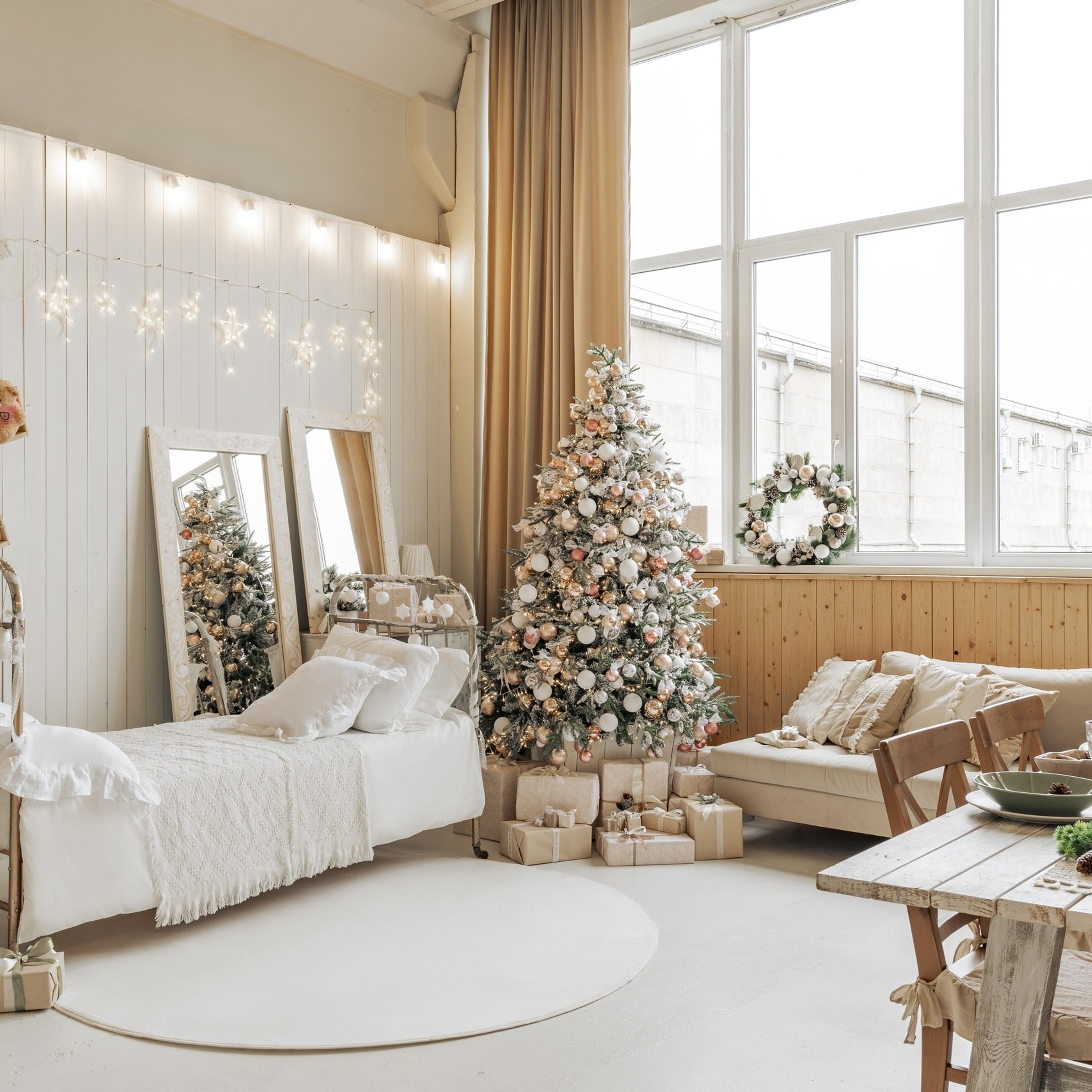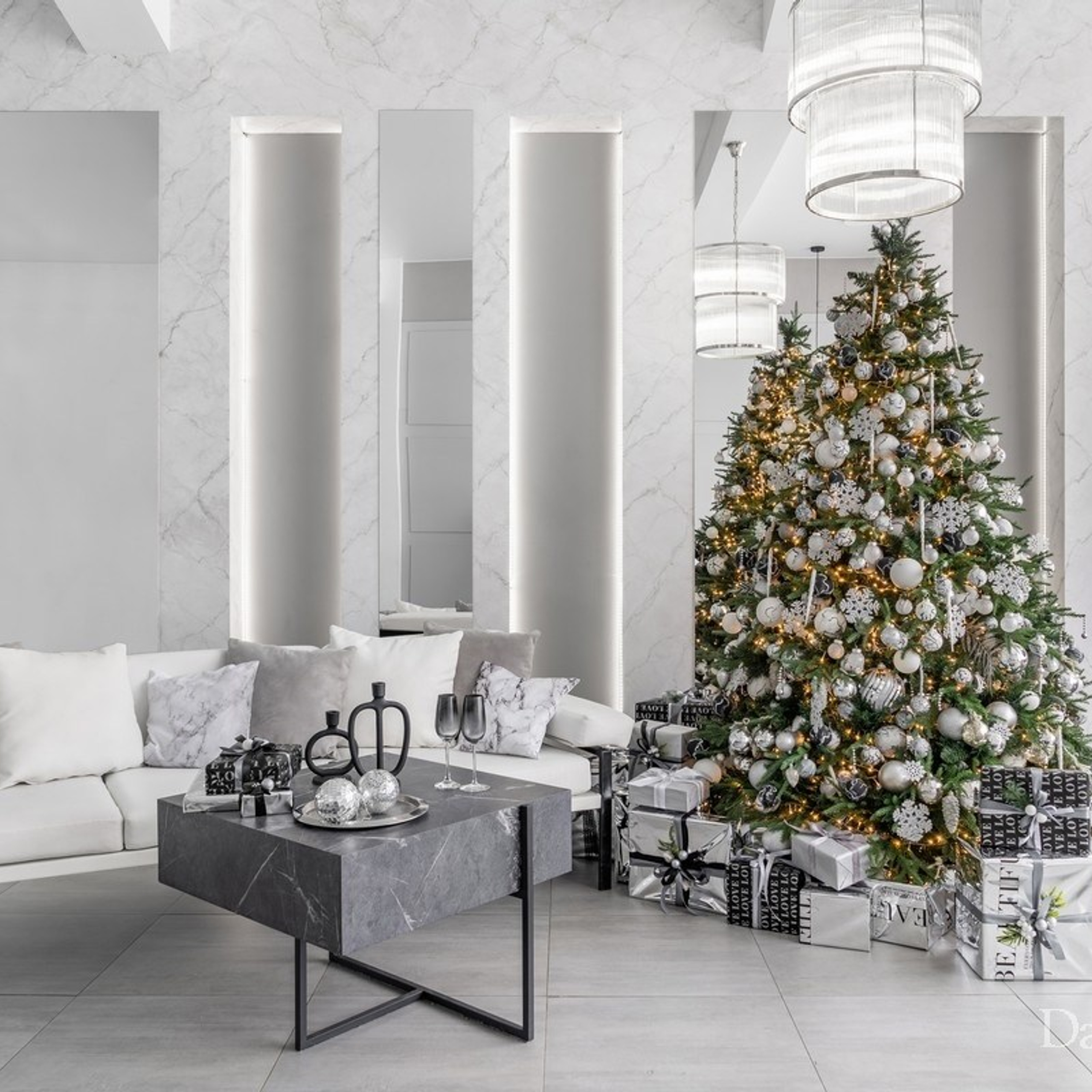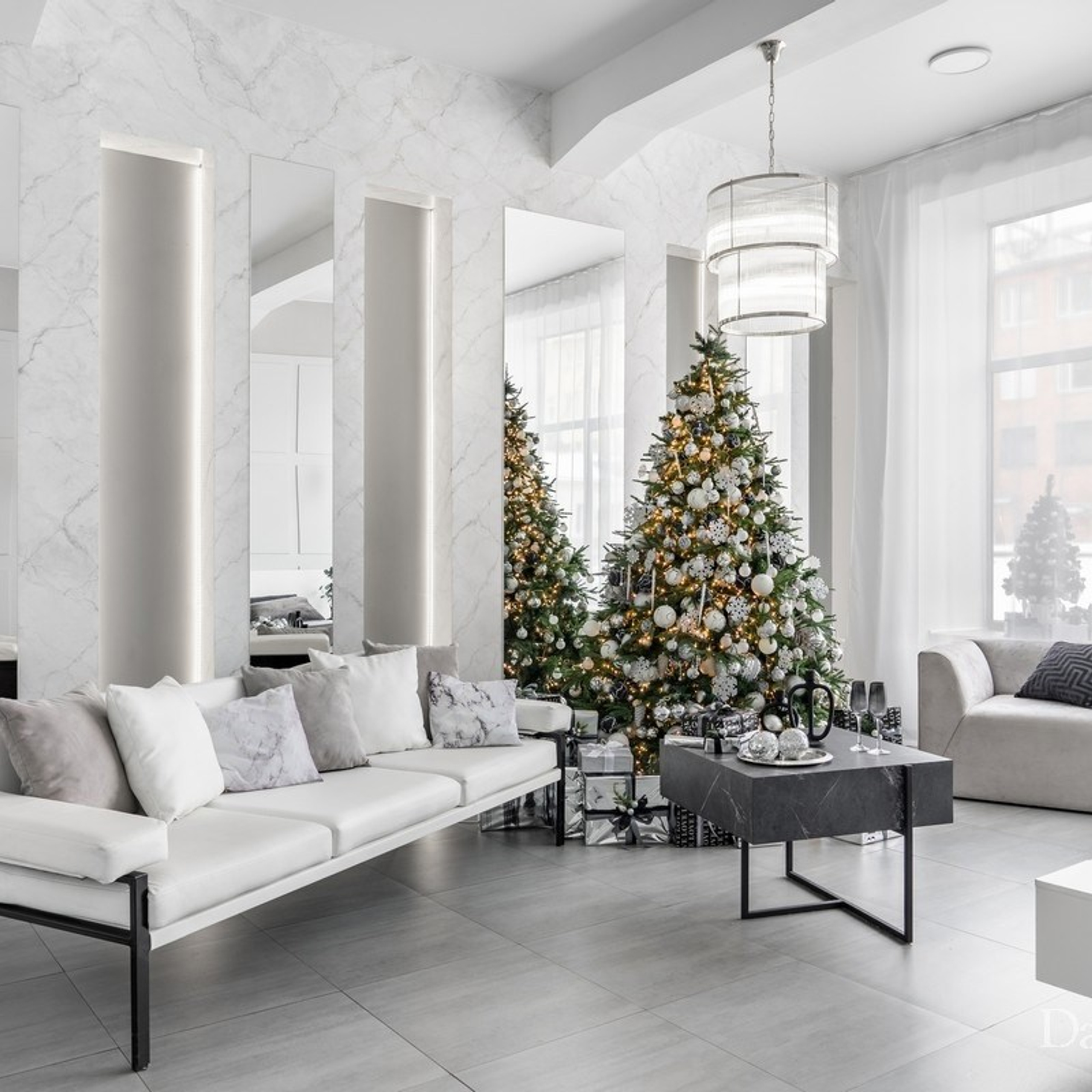 Светлый зал в стиле минимализм, украшен огромной елкой. В зале есть диванчик, кровать, детский стульчик, качелька.