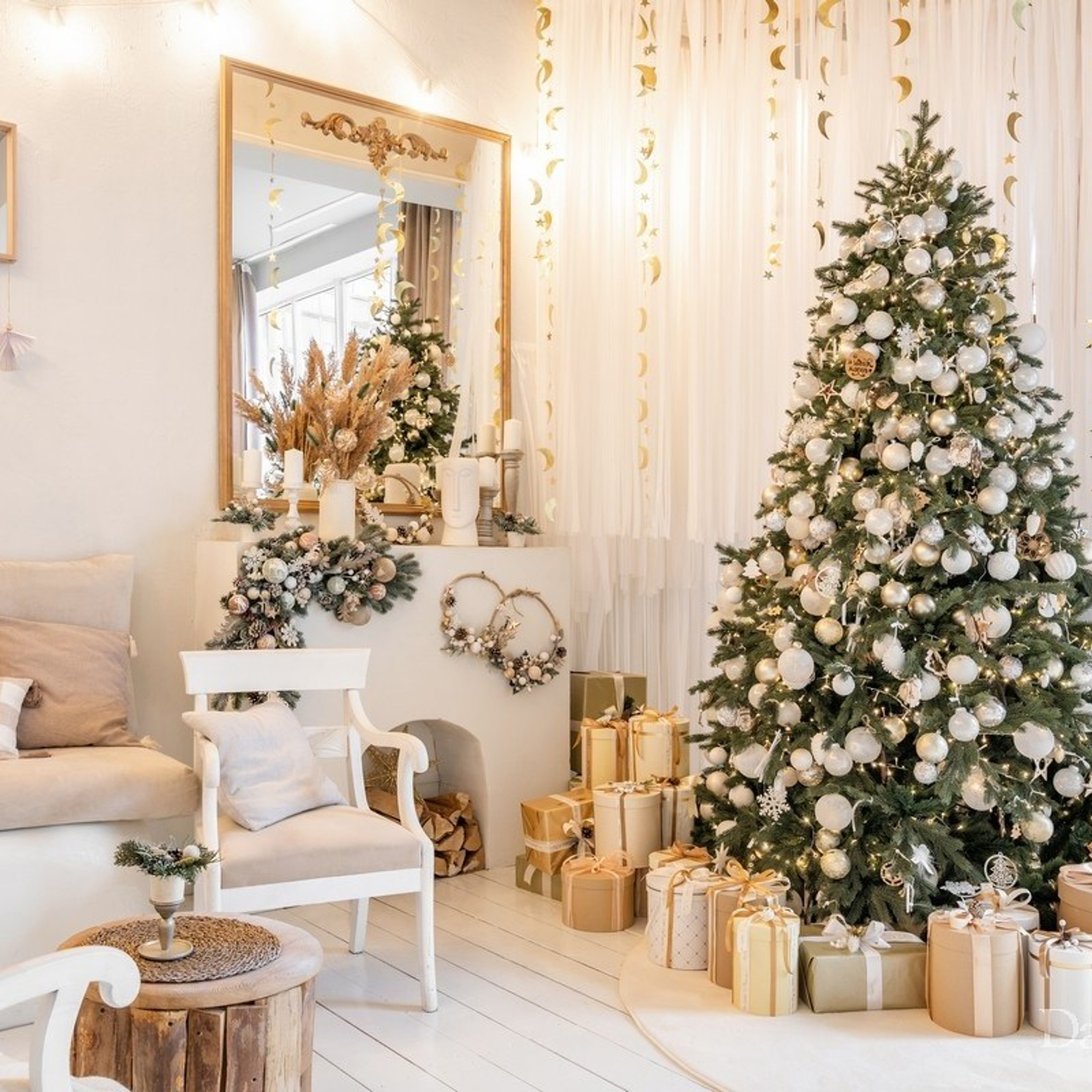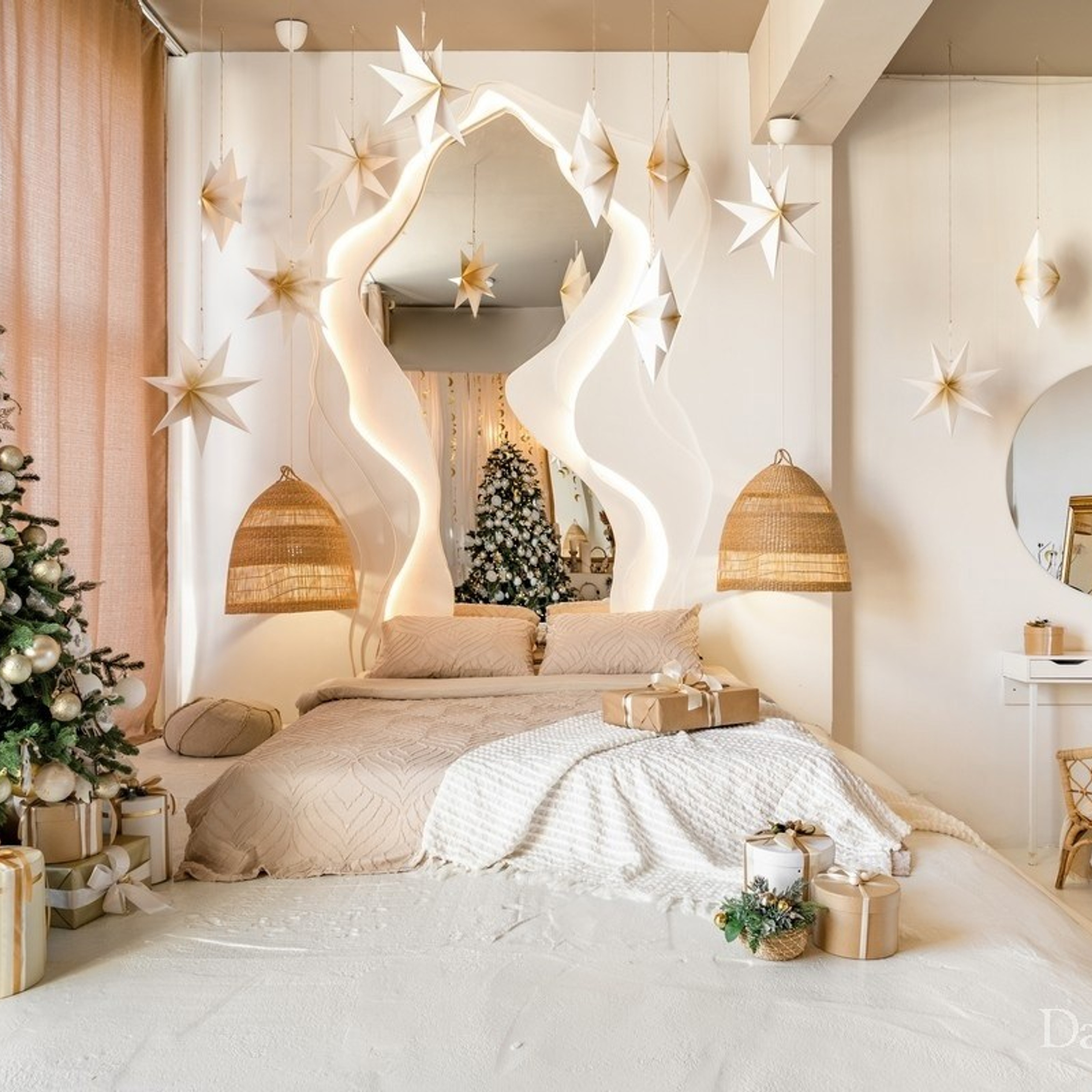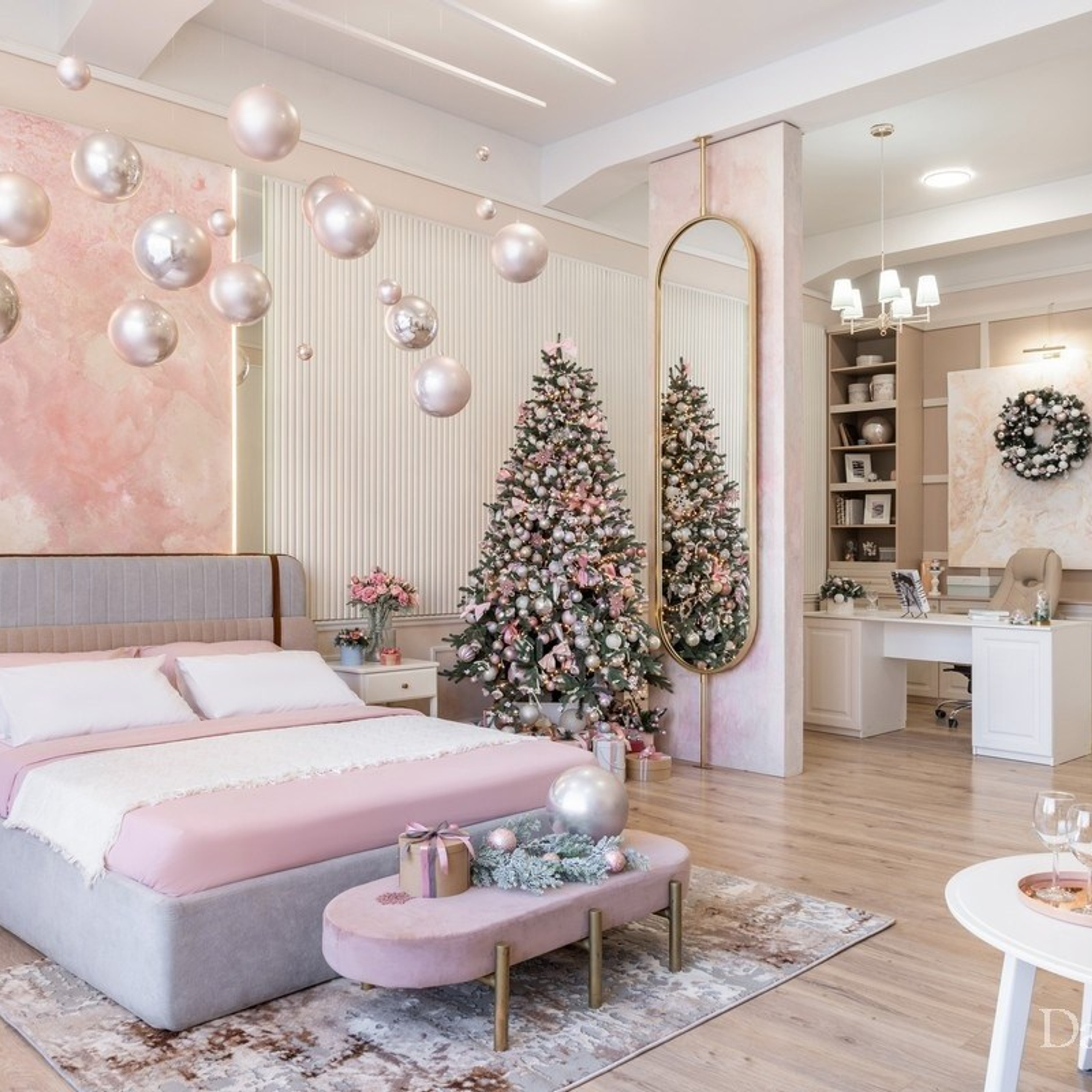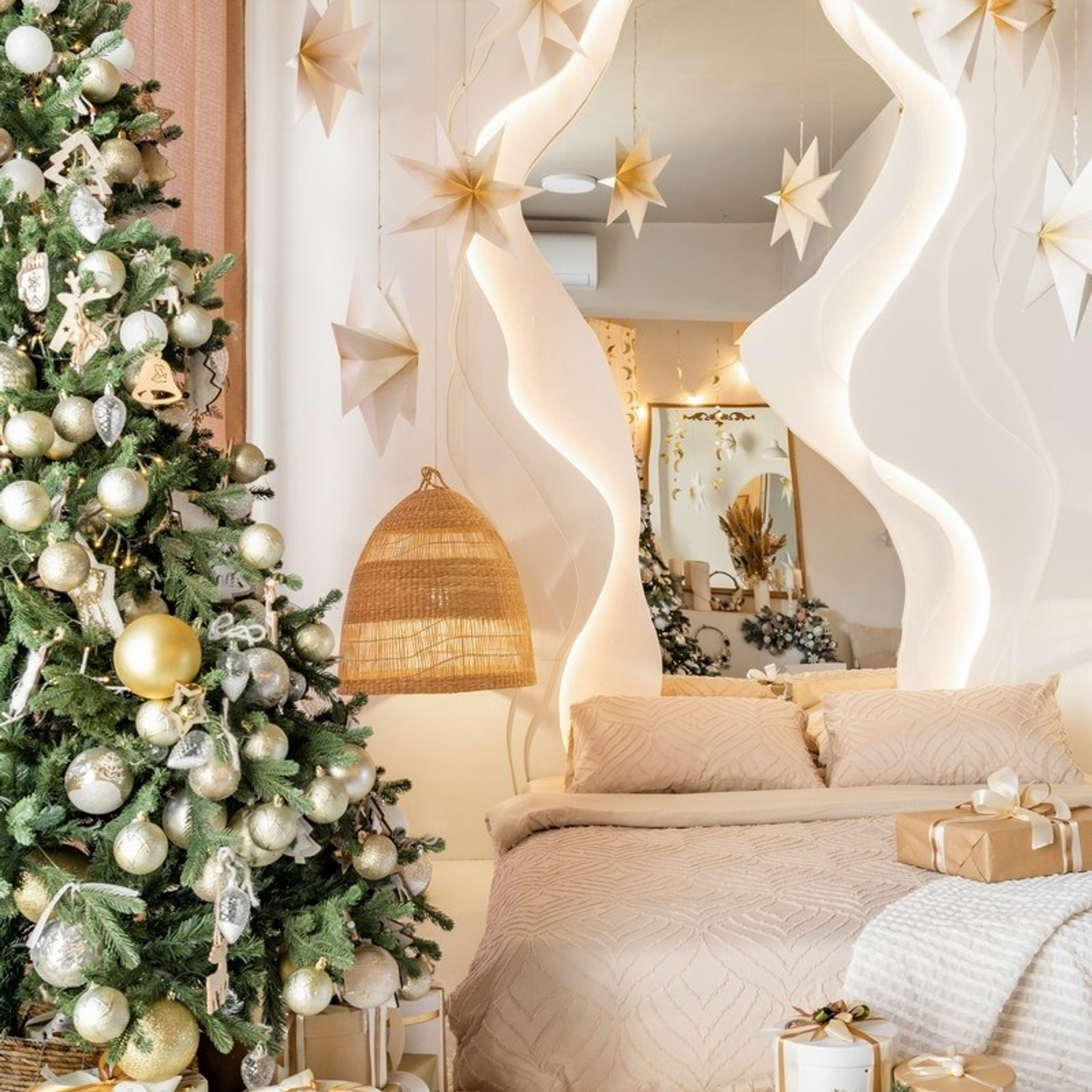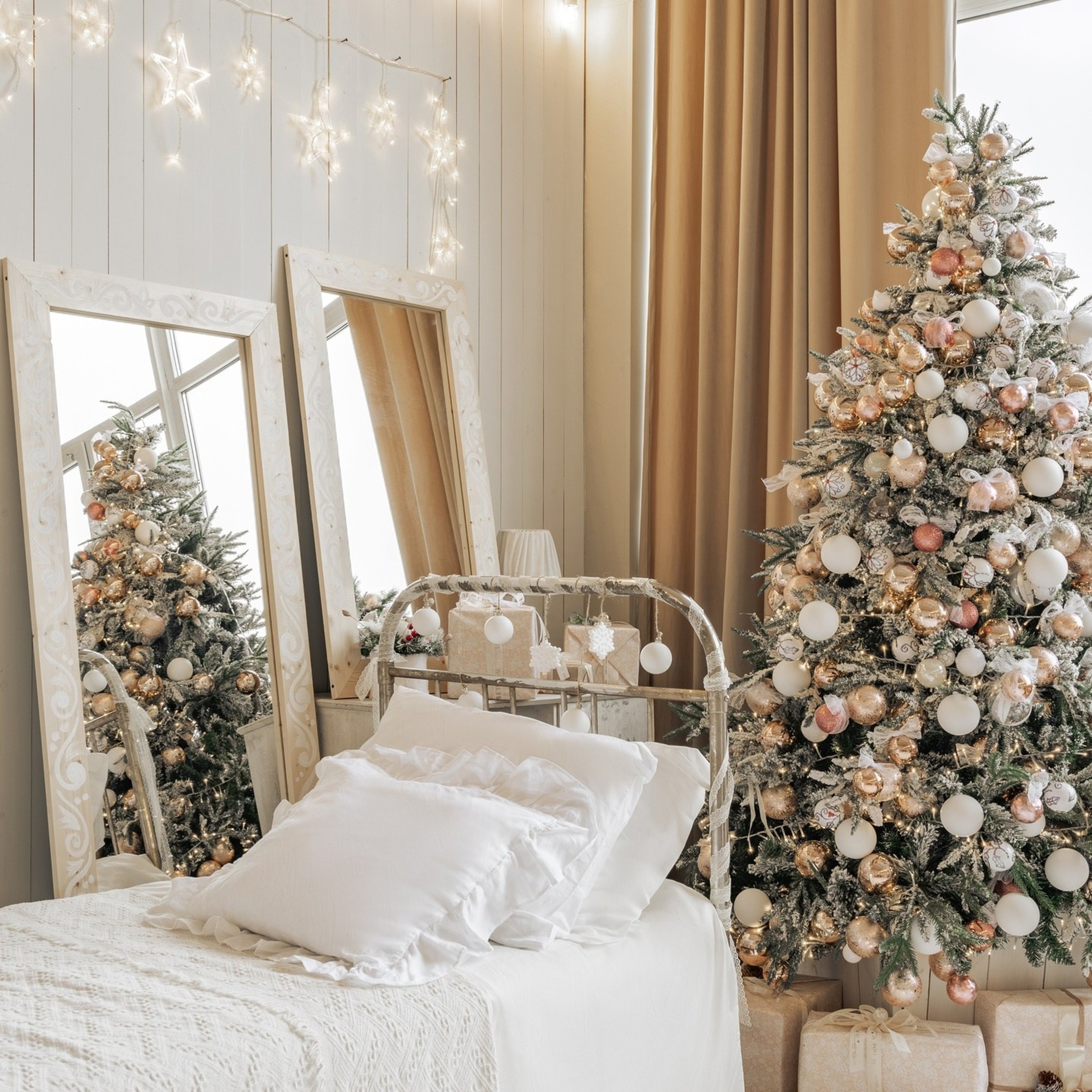 Светлый зал в стиле минимализм, украшен огромной елкой. В зале есть диванчик, кровать, детский стульчик, качелька.