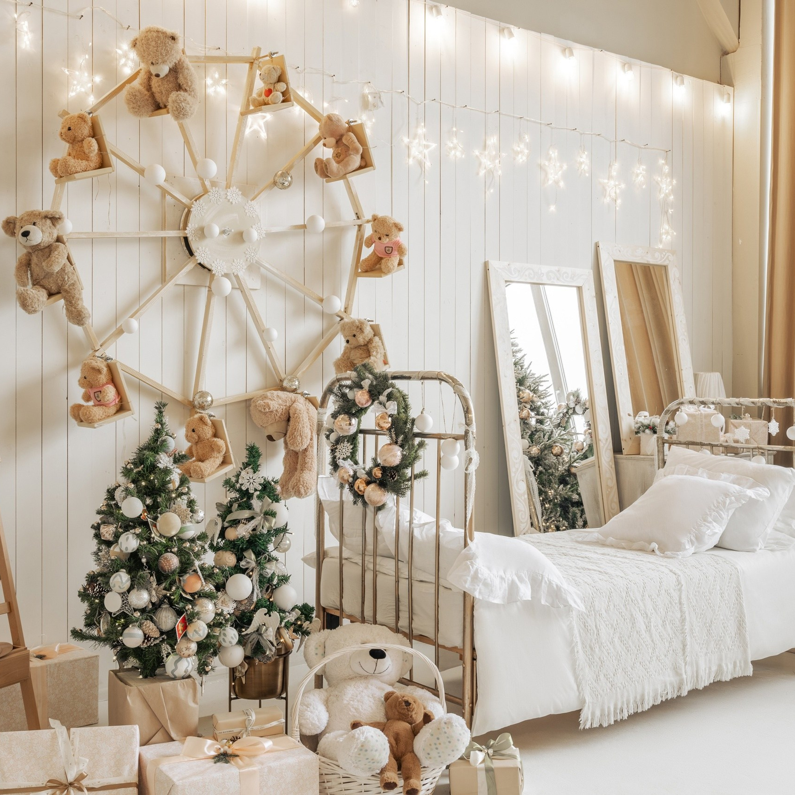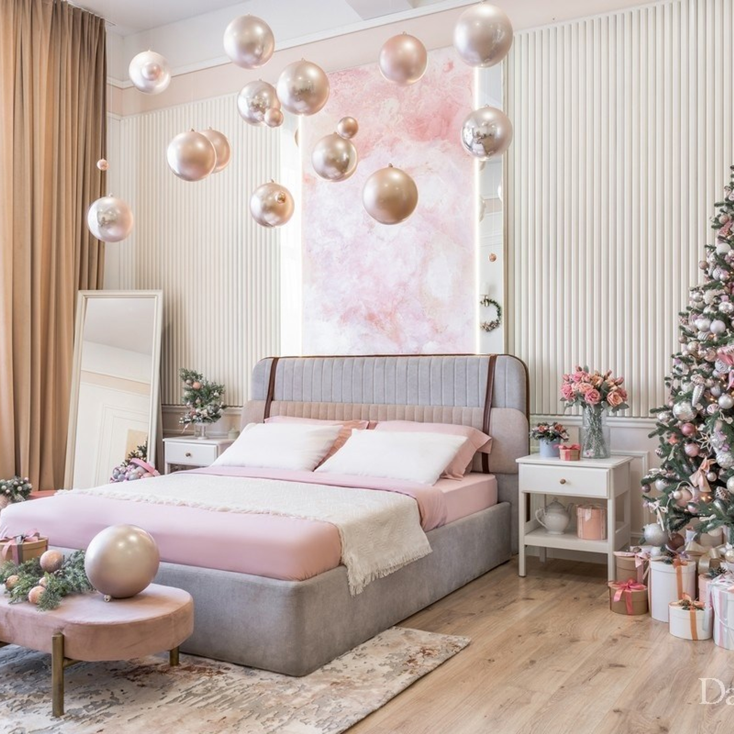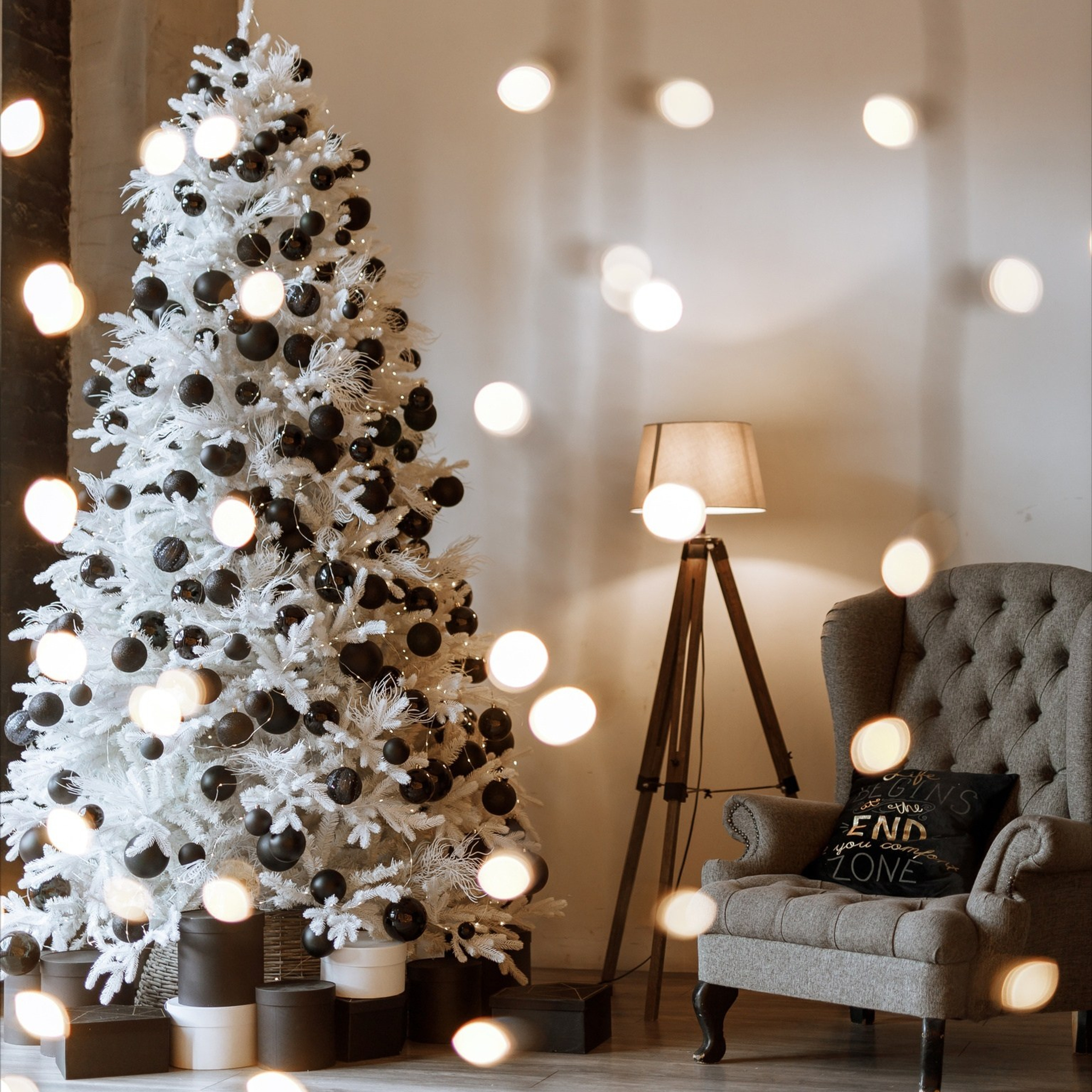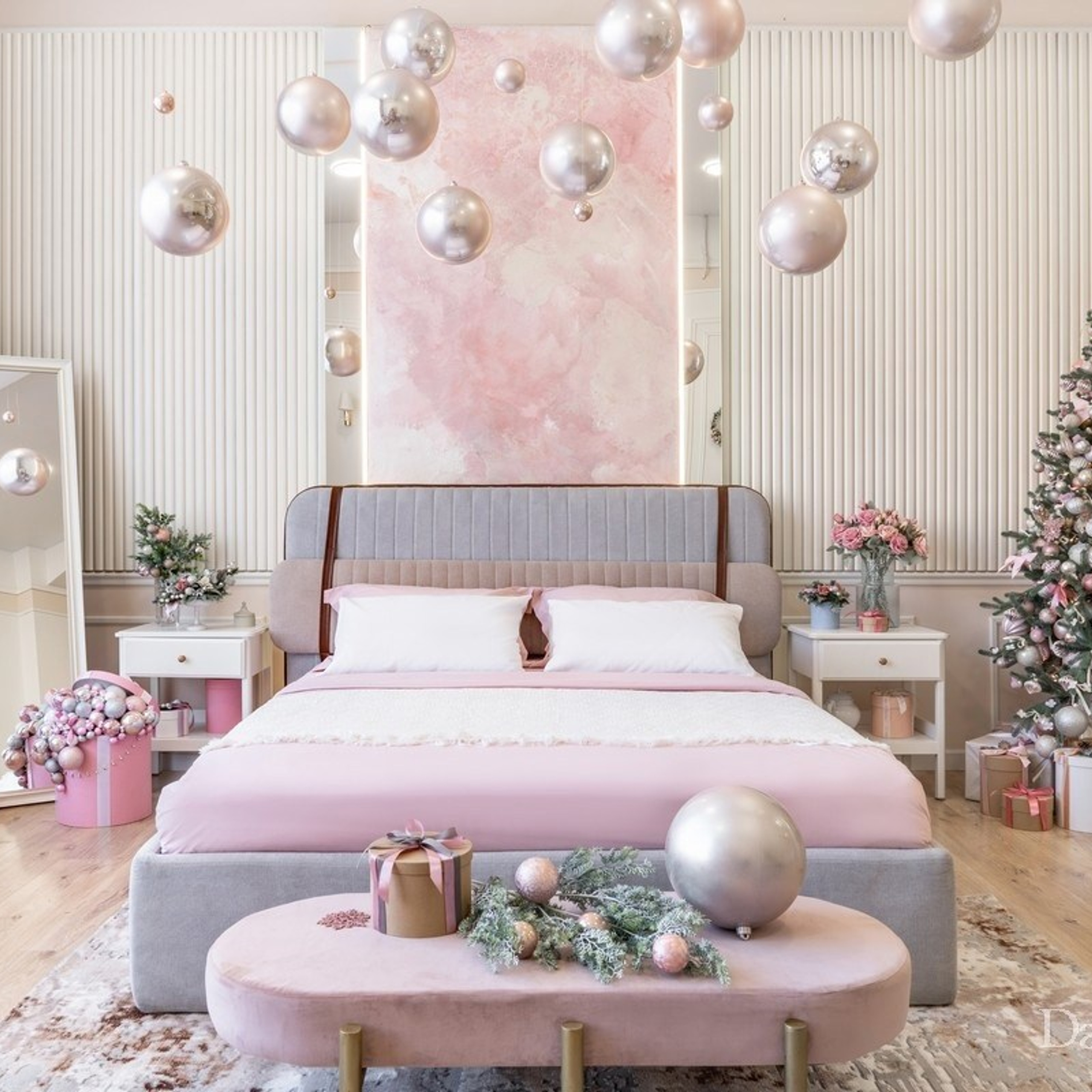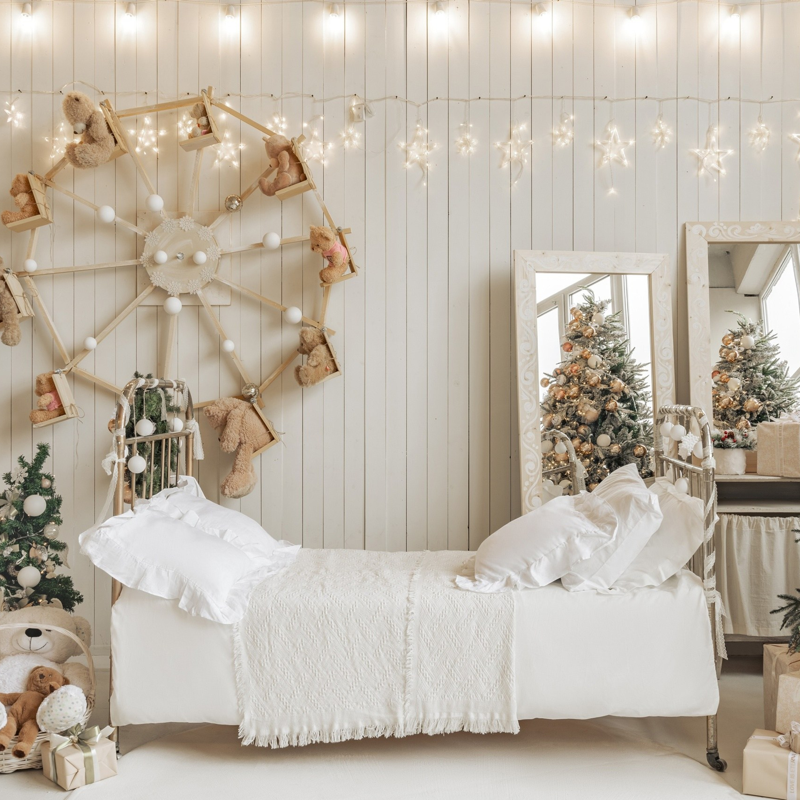 Светлый зал в стиле минимализм, украшен огромной елкой. В зале есть диванчик, кровать, детский стульчик, качелька.