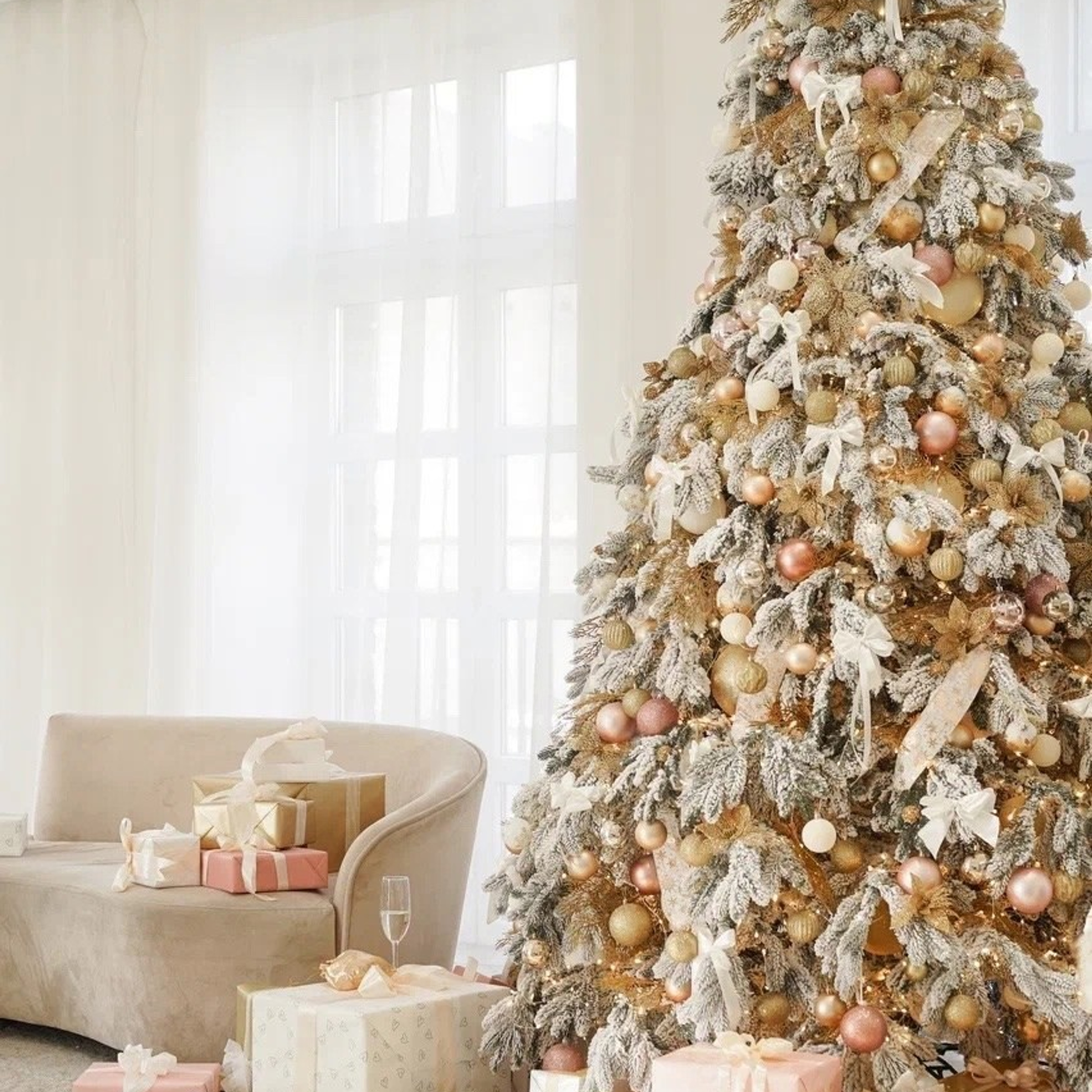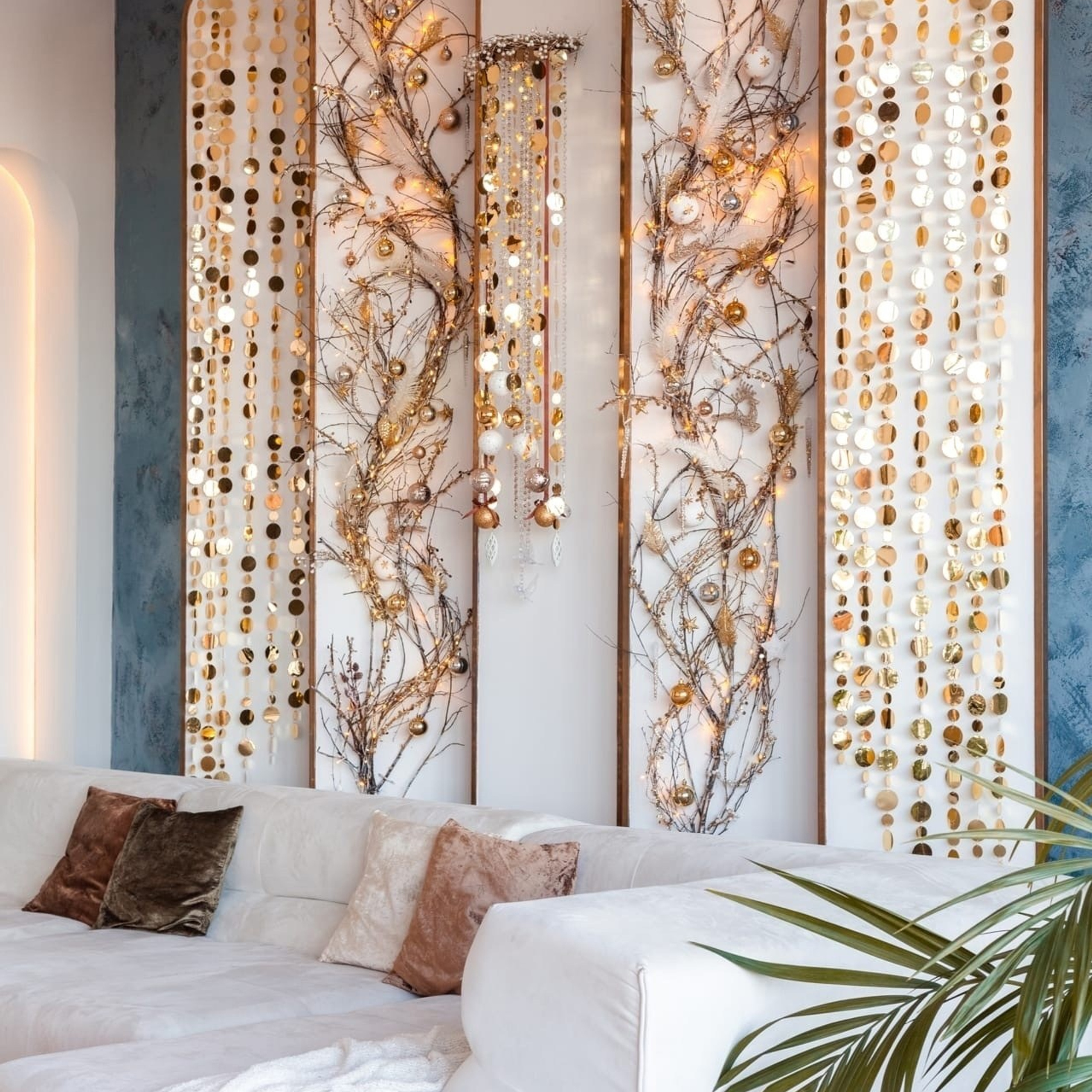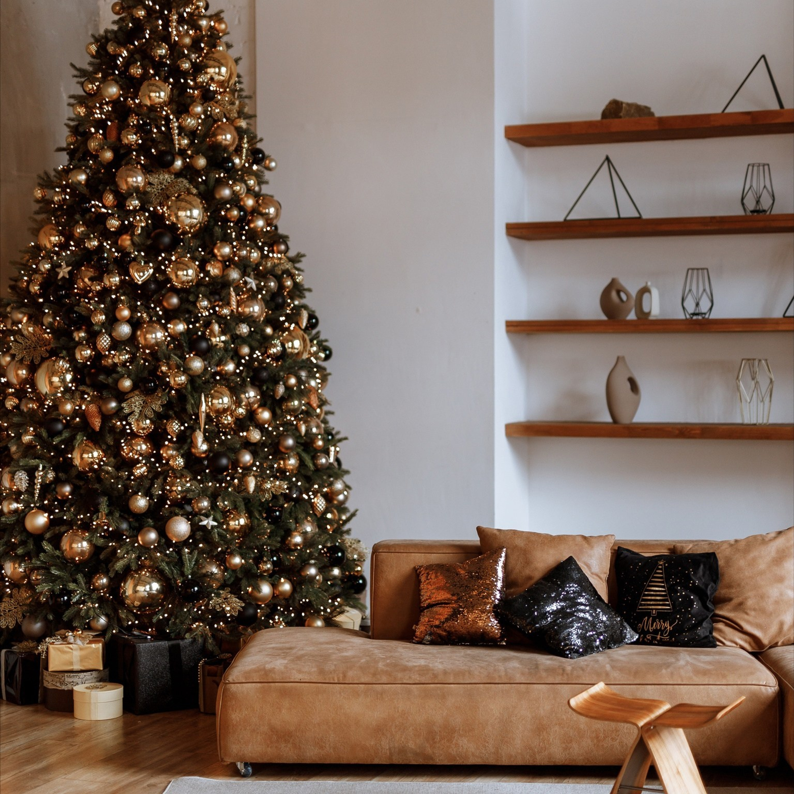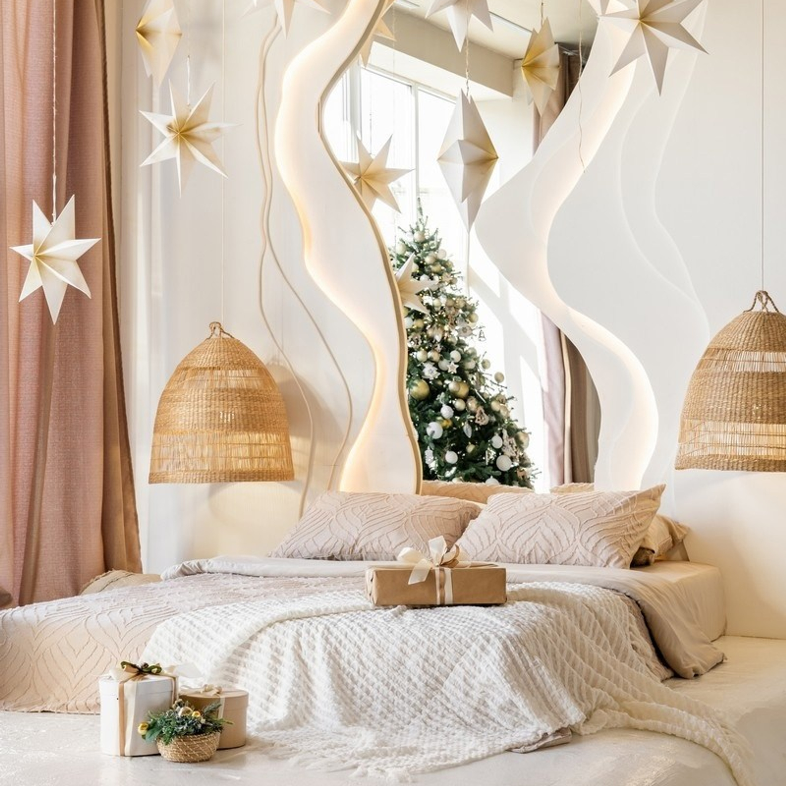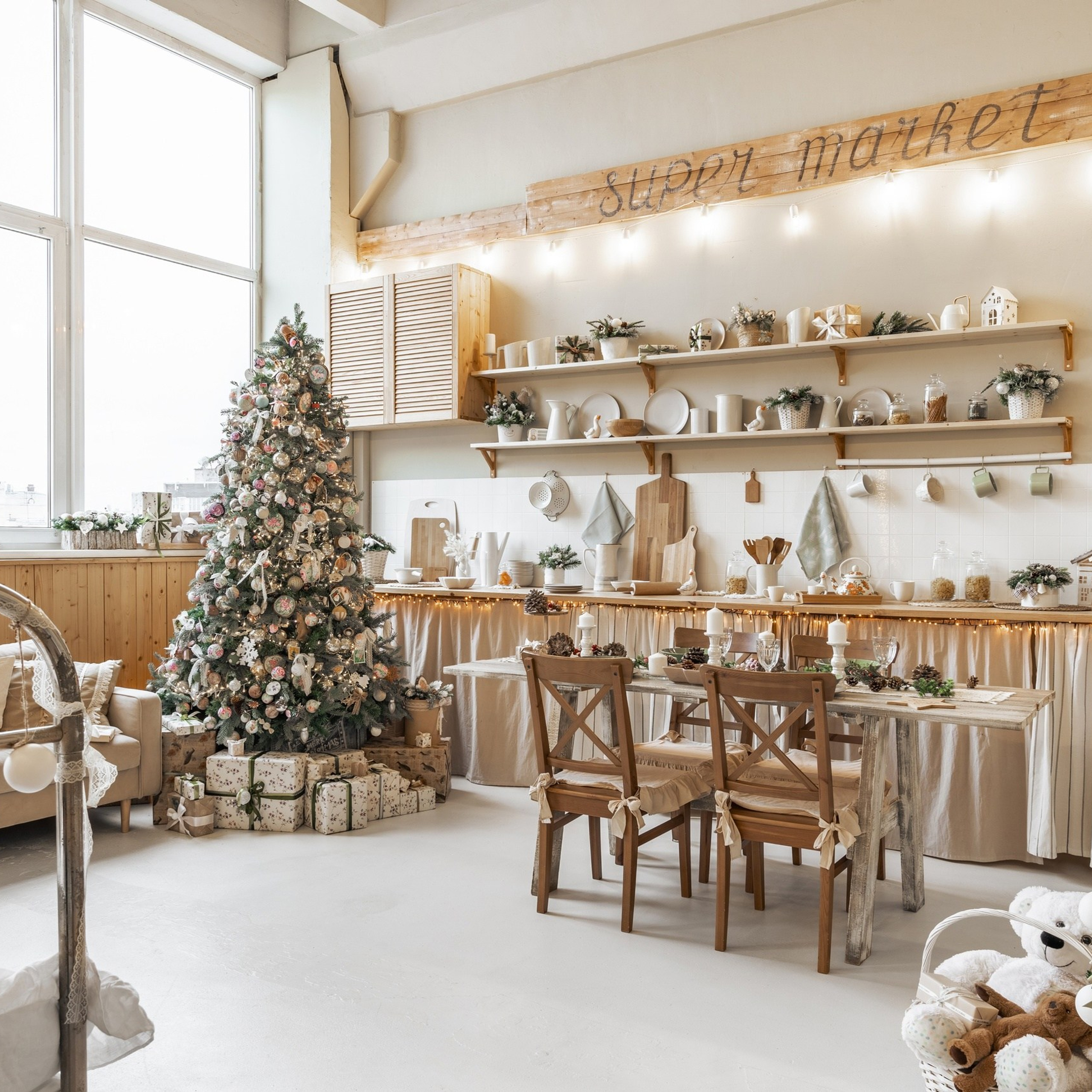 Светлый зал в стиле минимализм, украшен огромной елкой. В зале есть диванчик, кровать, детский стульчик, качелька.