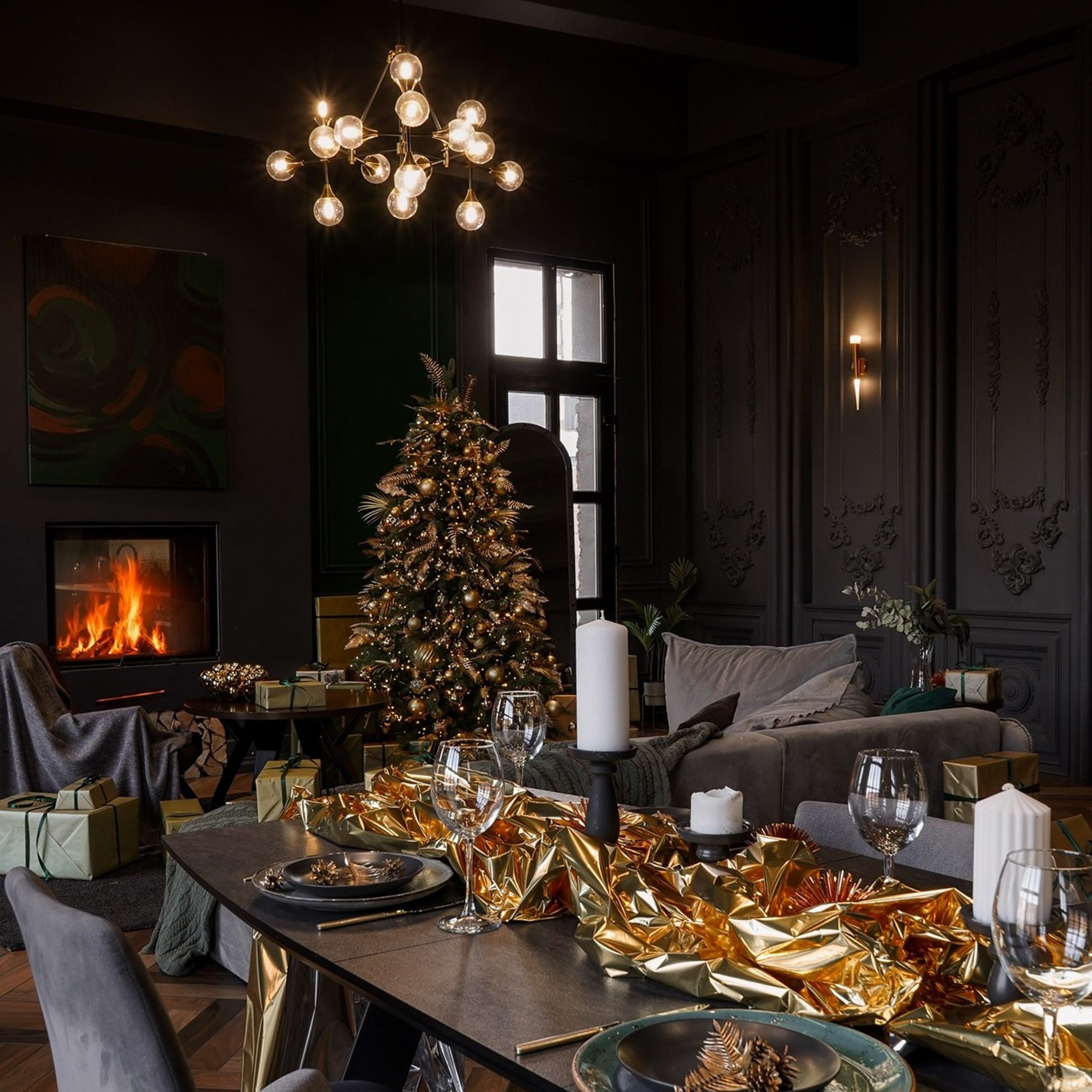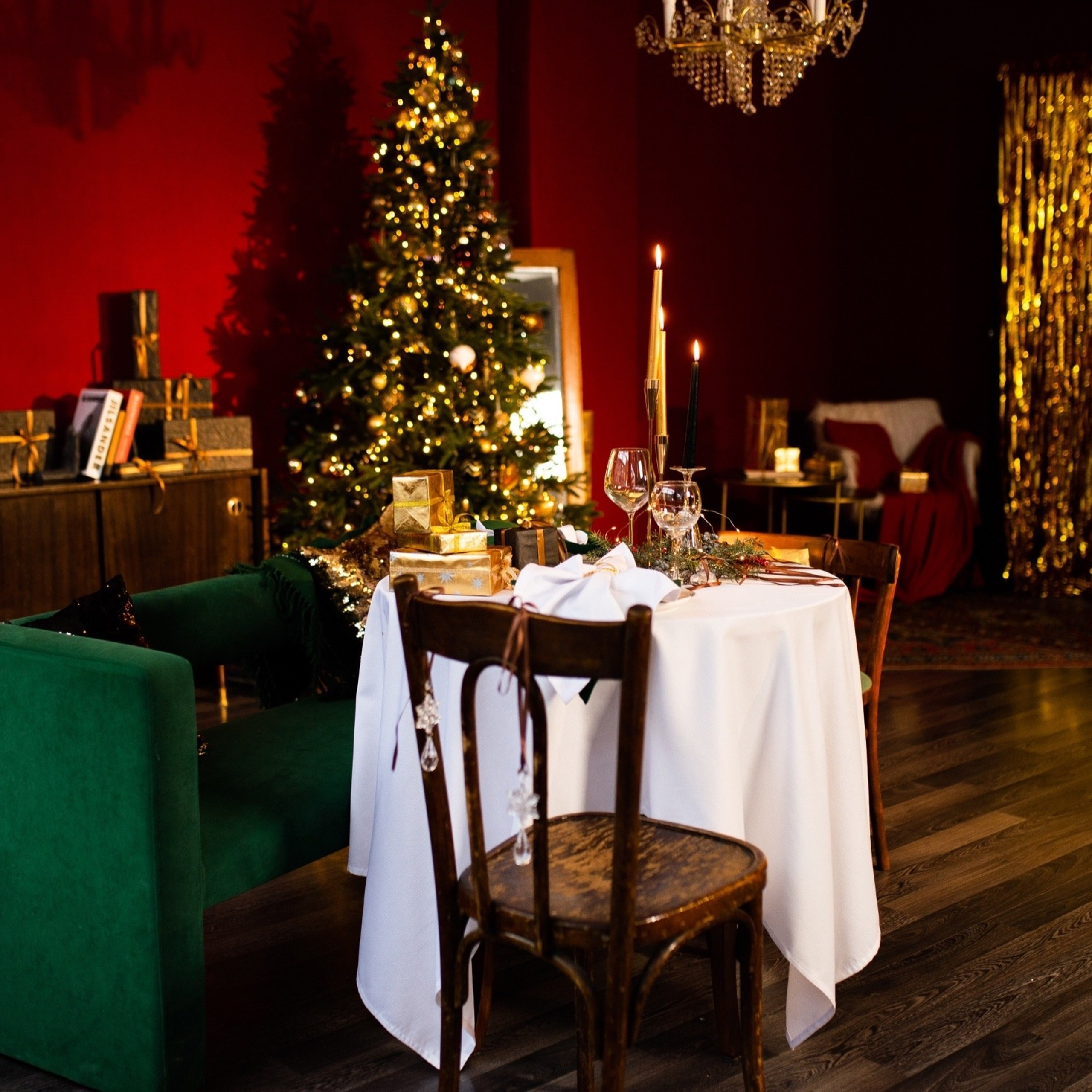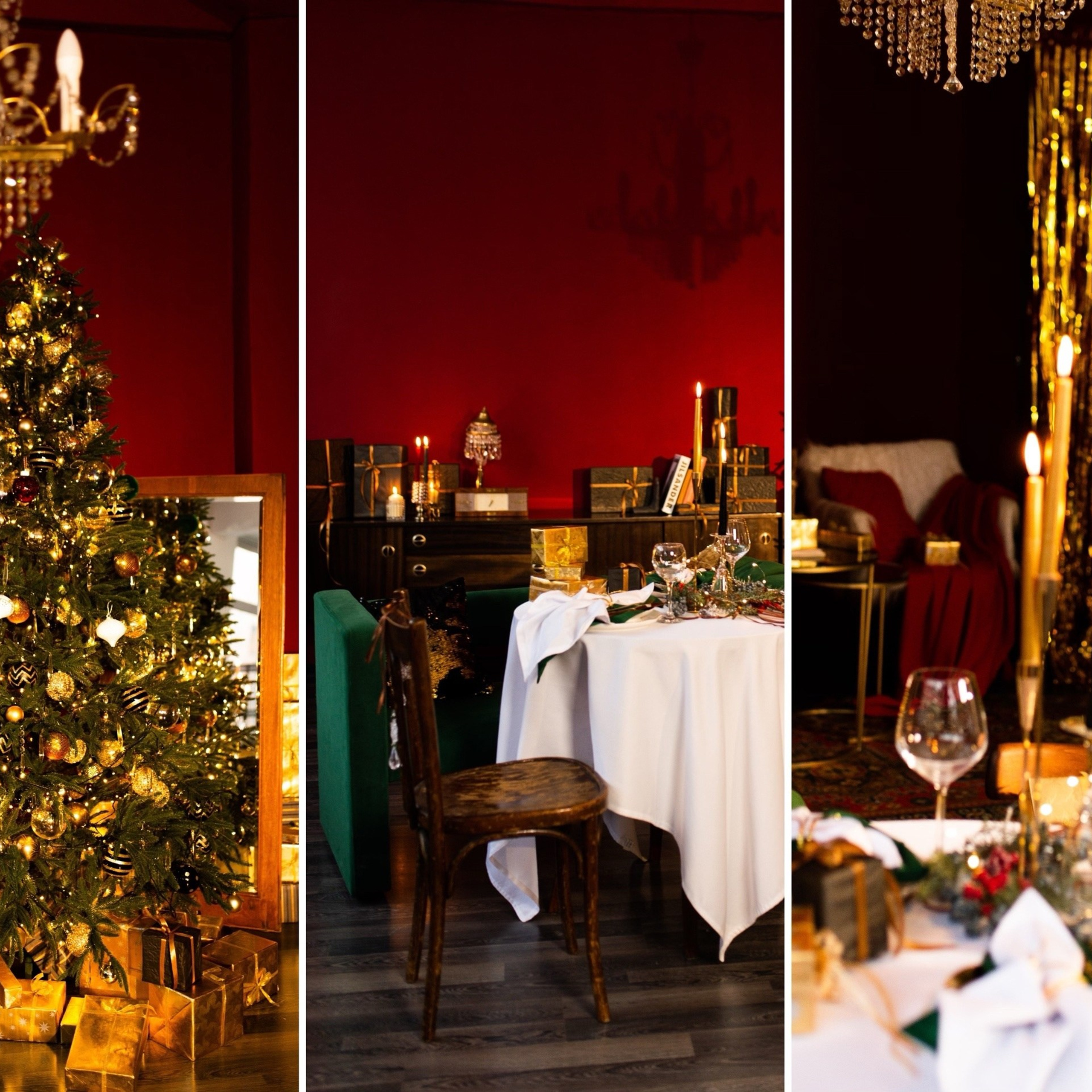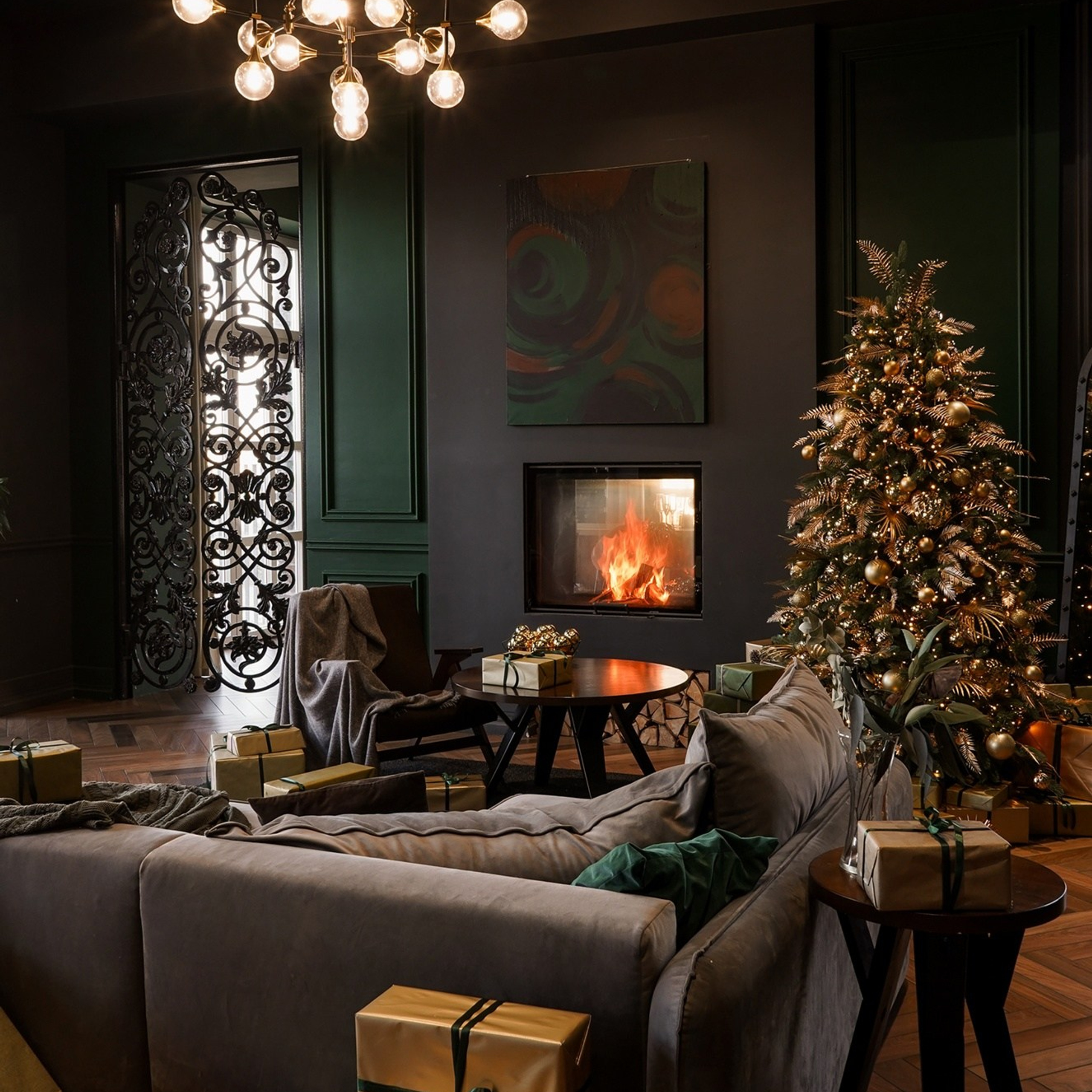 Классическая классика, салон 19 века в новогоднее время. Идеально пить чаек отставив пальчик в сторону. 2 зоны — более светлая и более темная, в едином стиле.