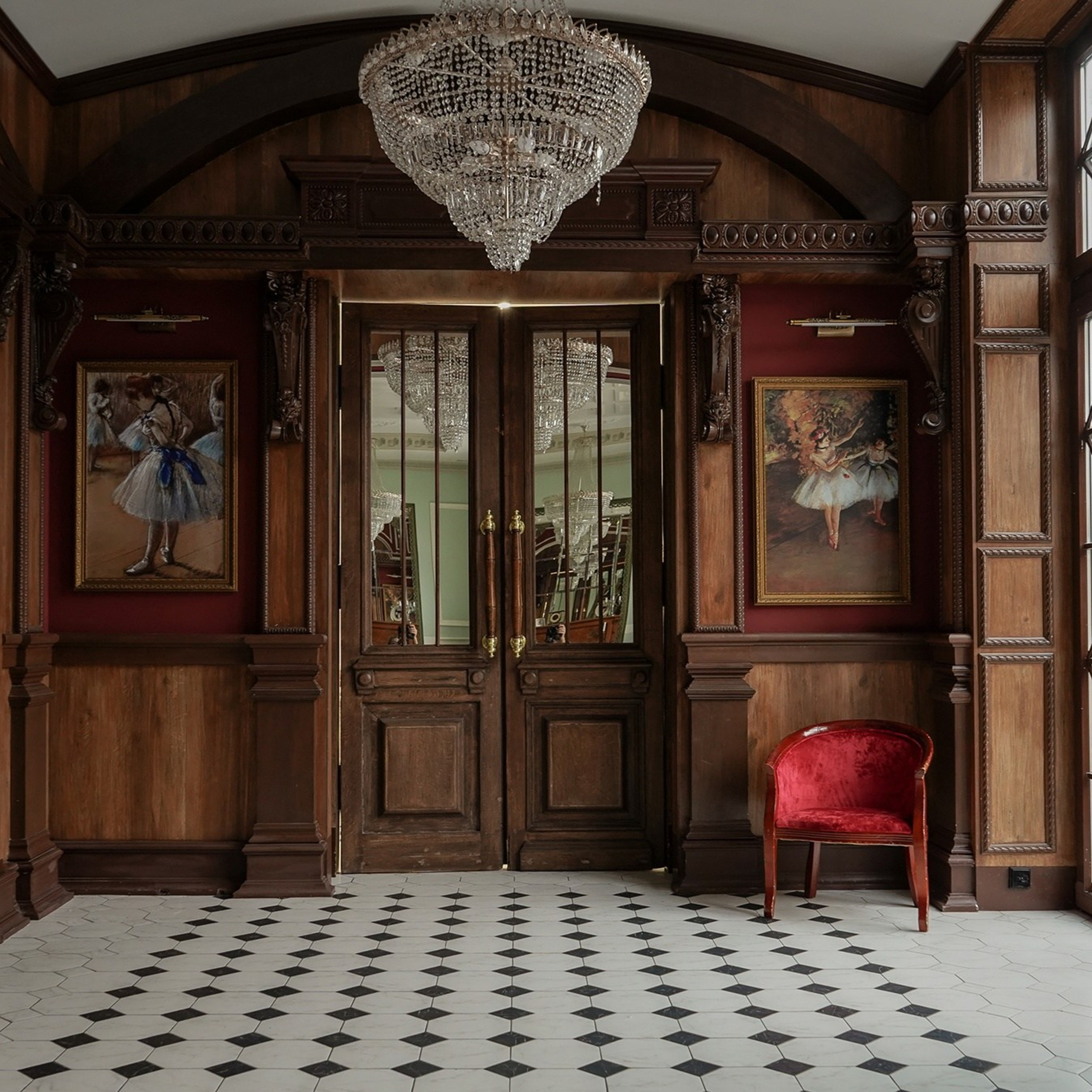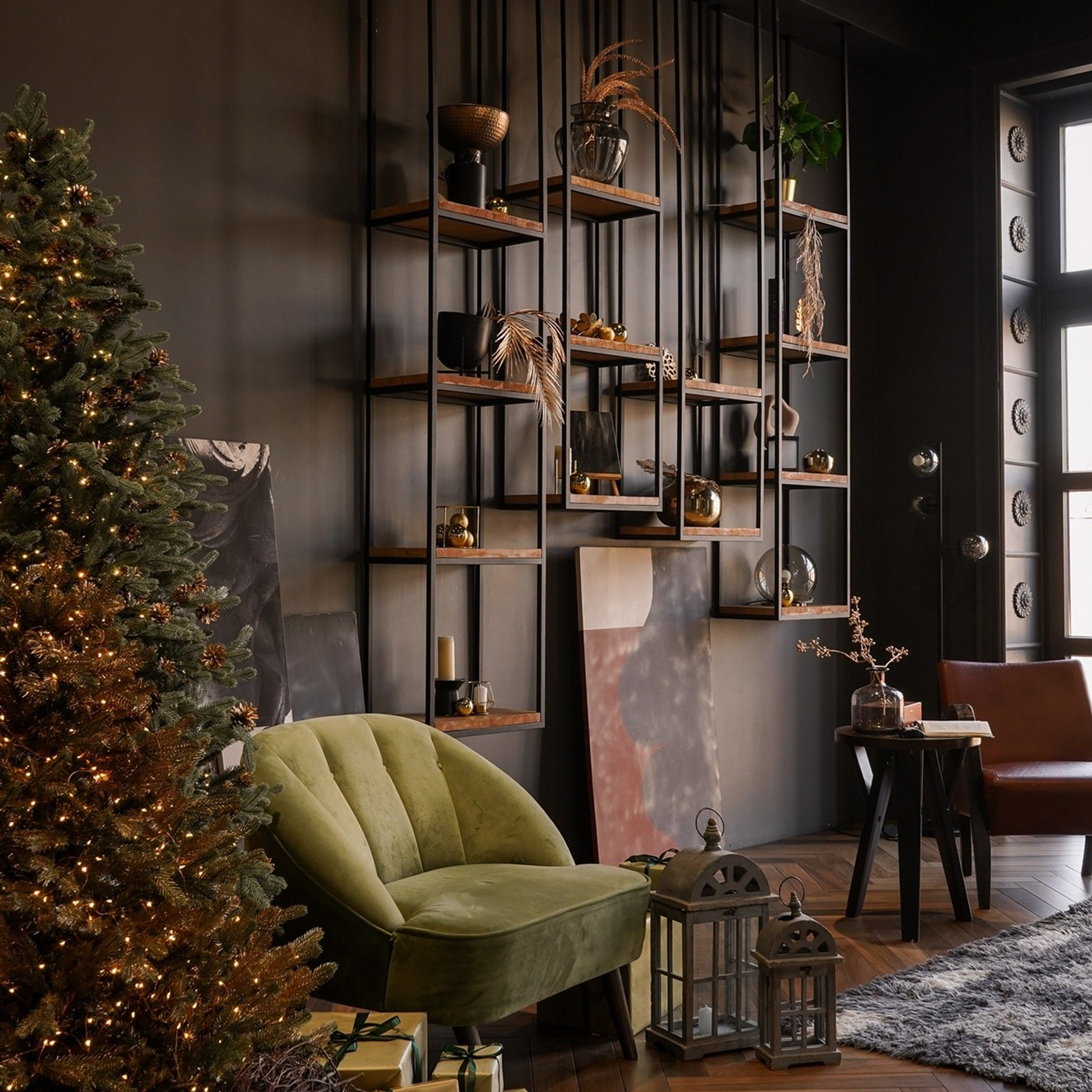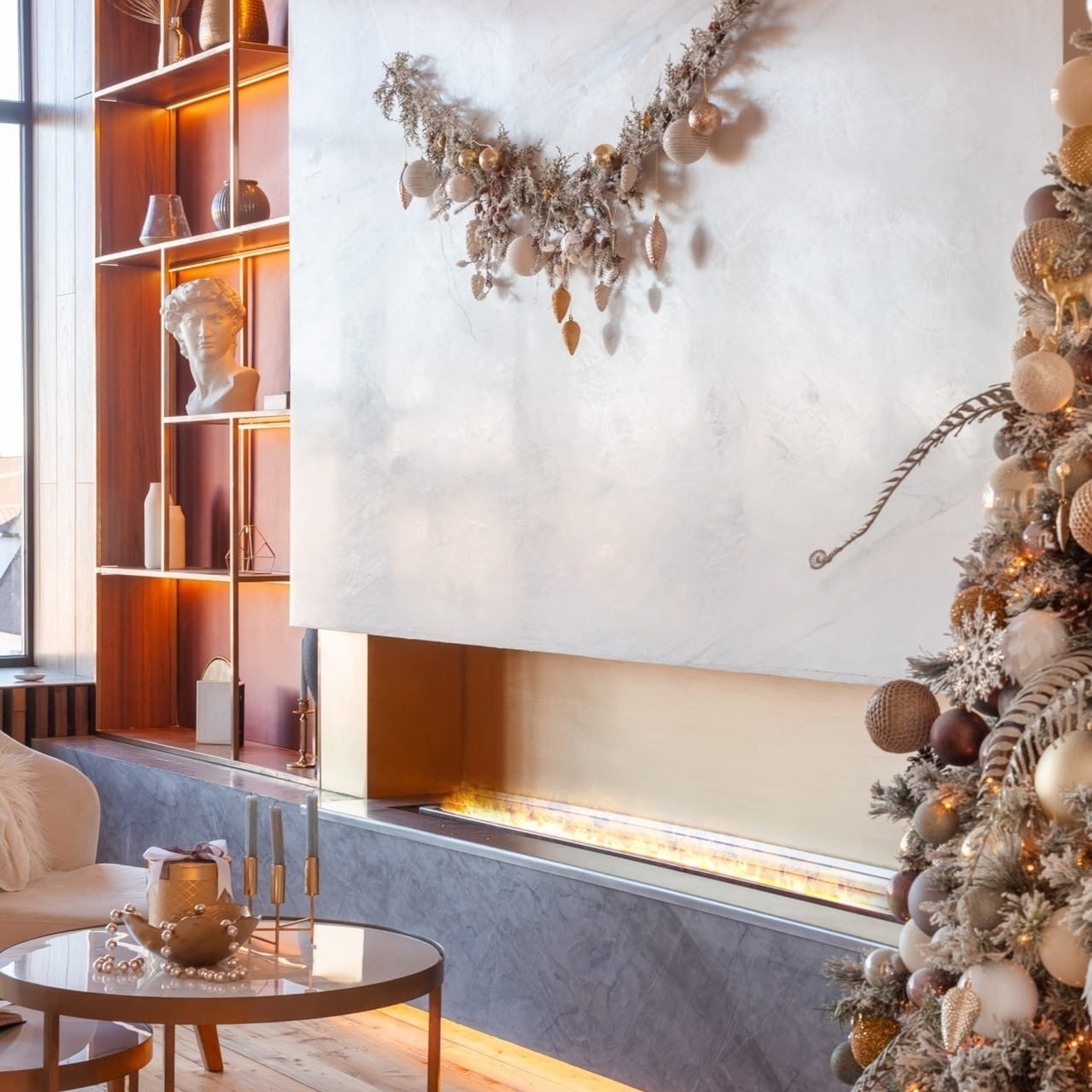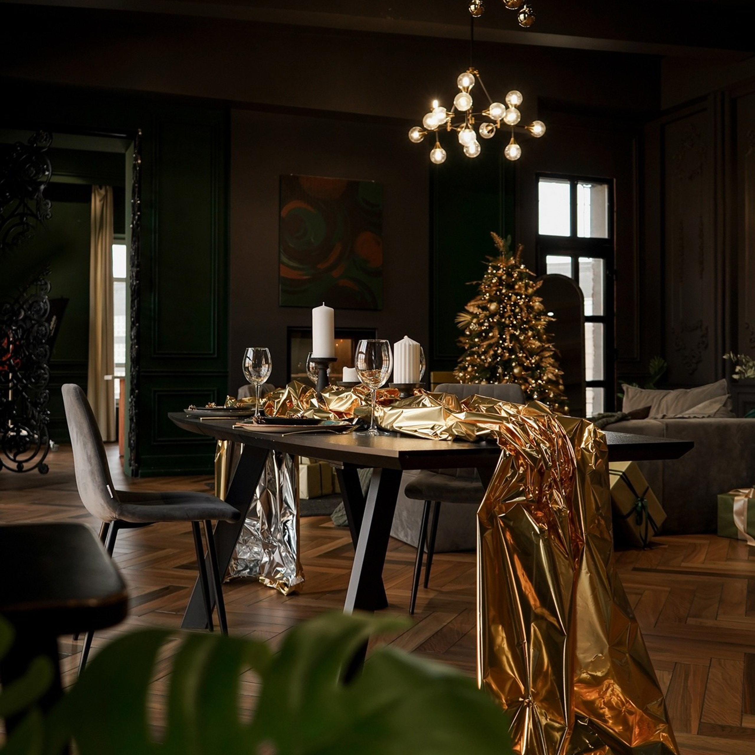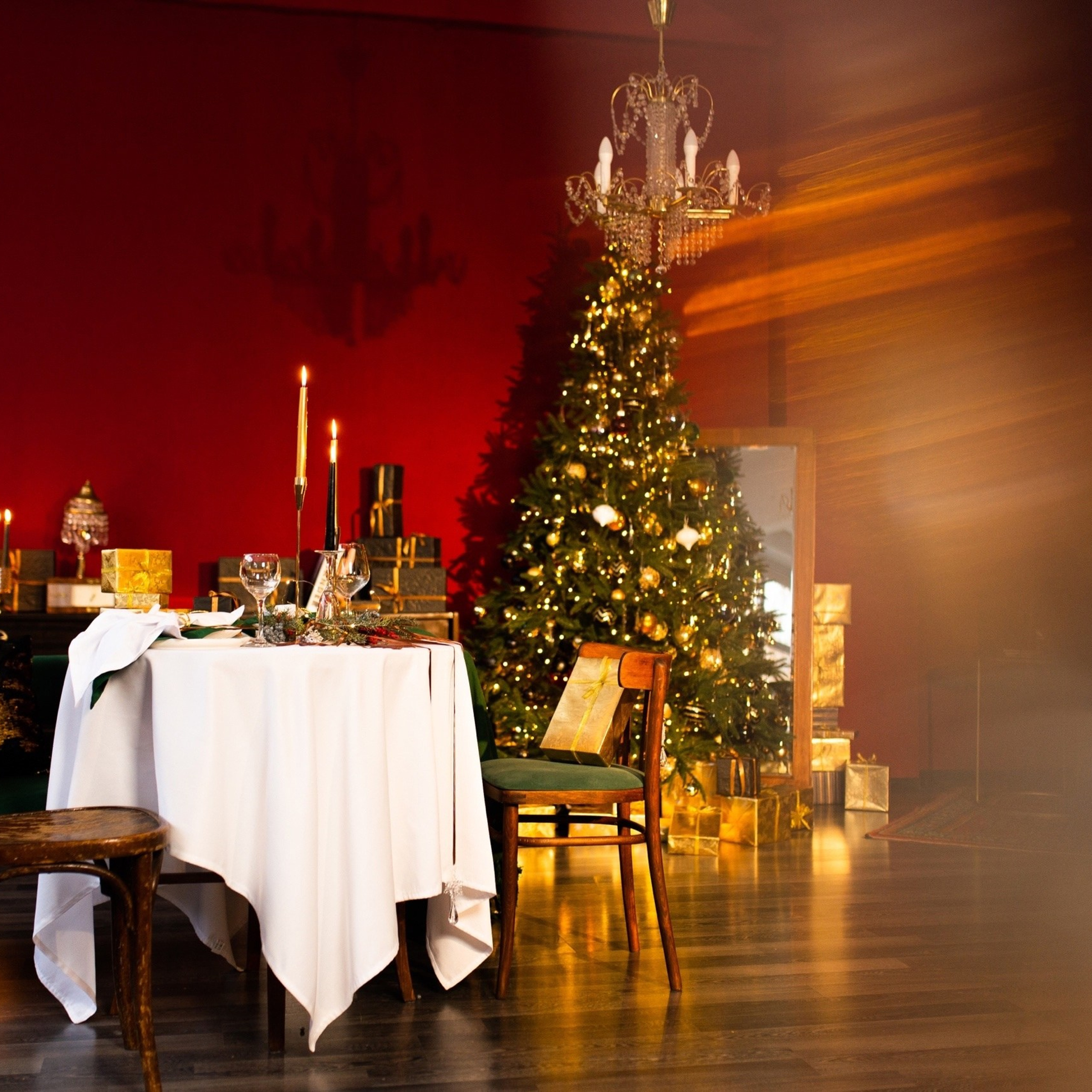 Классическая классика, салон 19 века в новогоднее время. Идеально пить чаек отставив пальчик в сторону. 2 зоны — более светлая и более темная, в едином стиле.