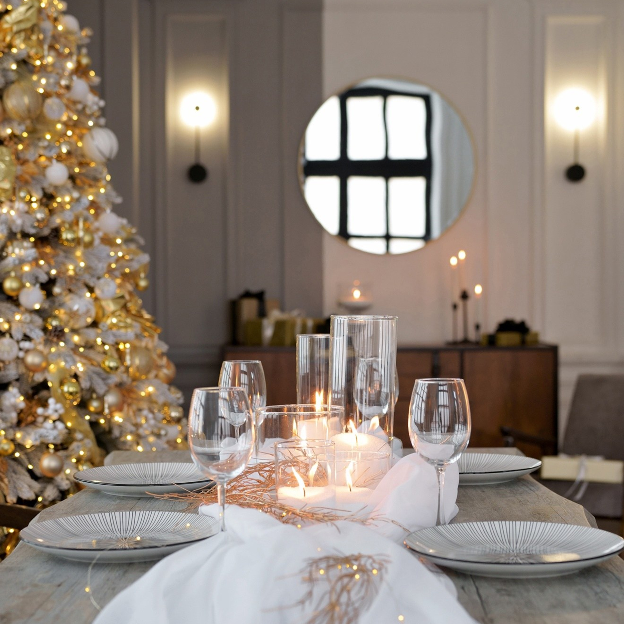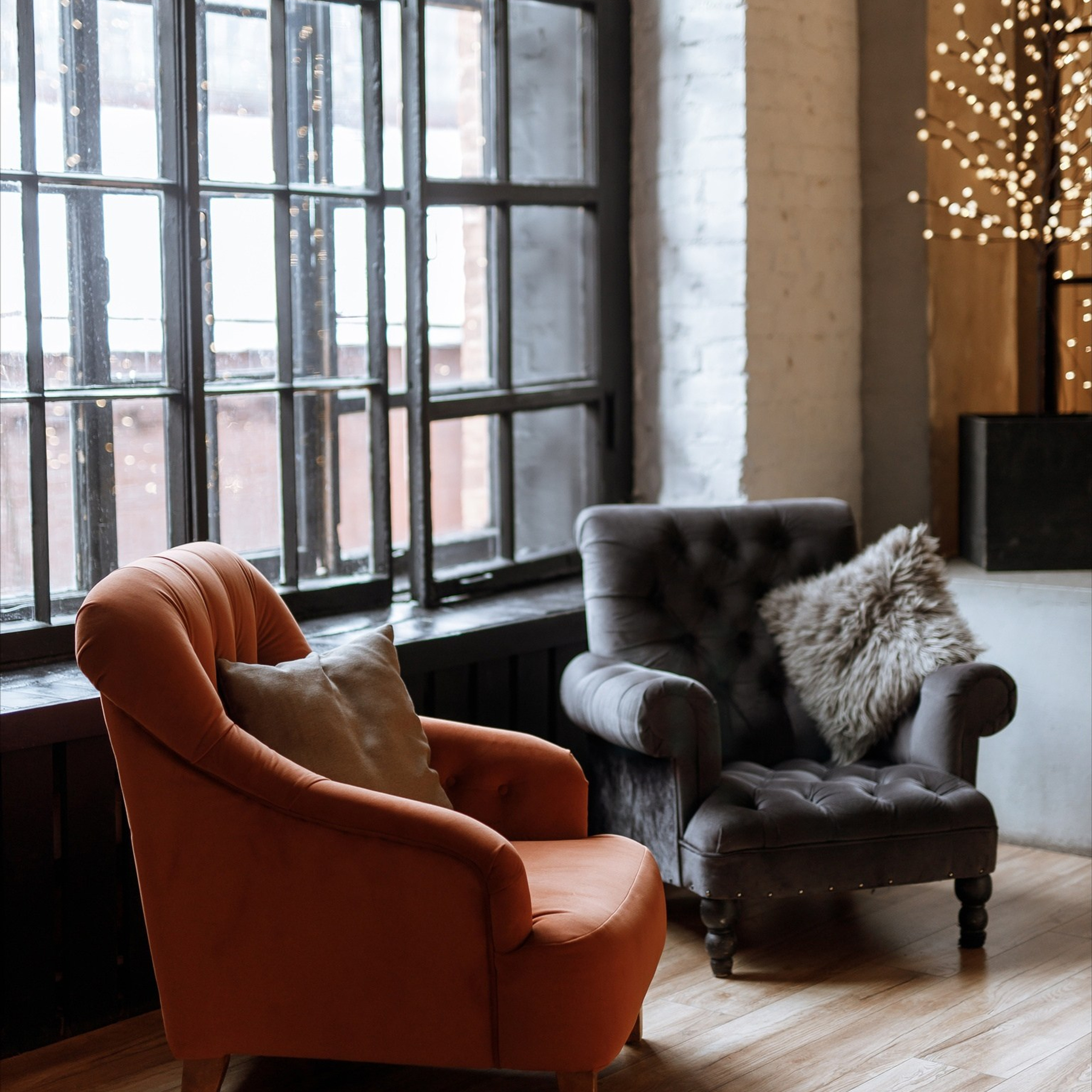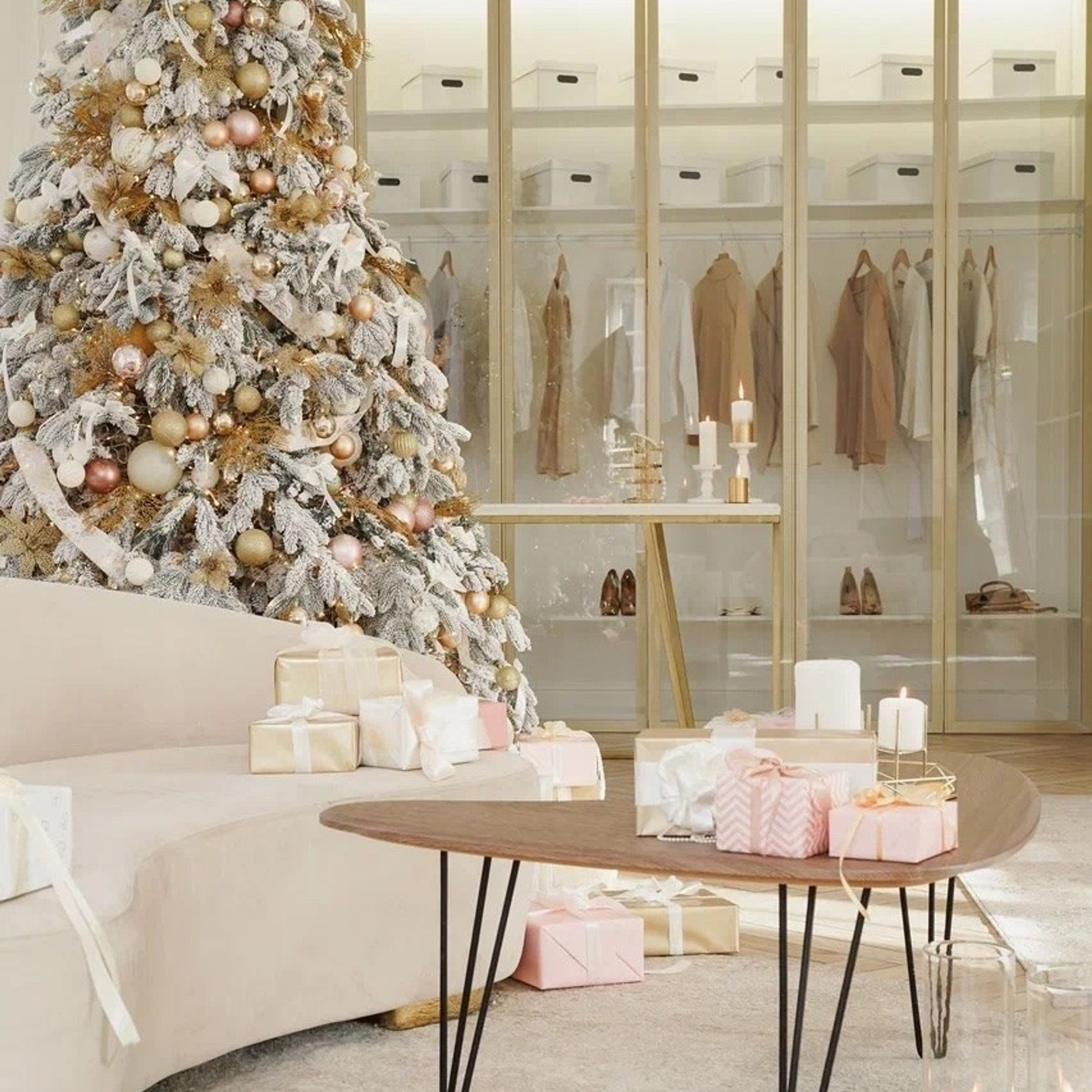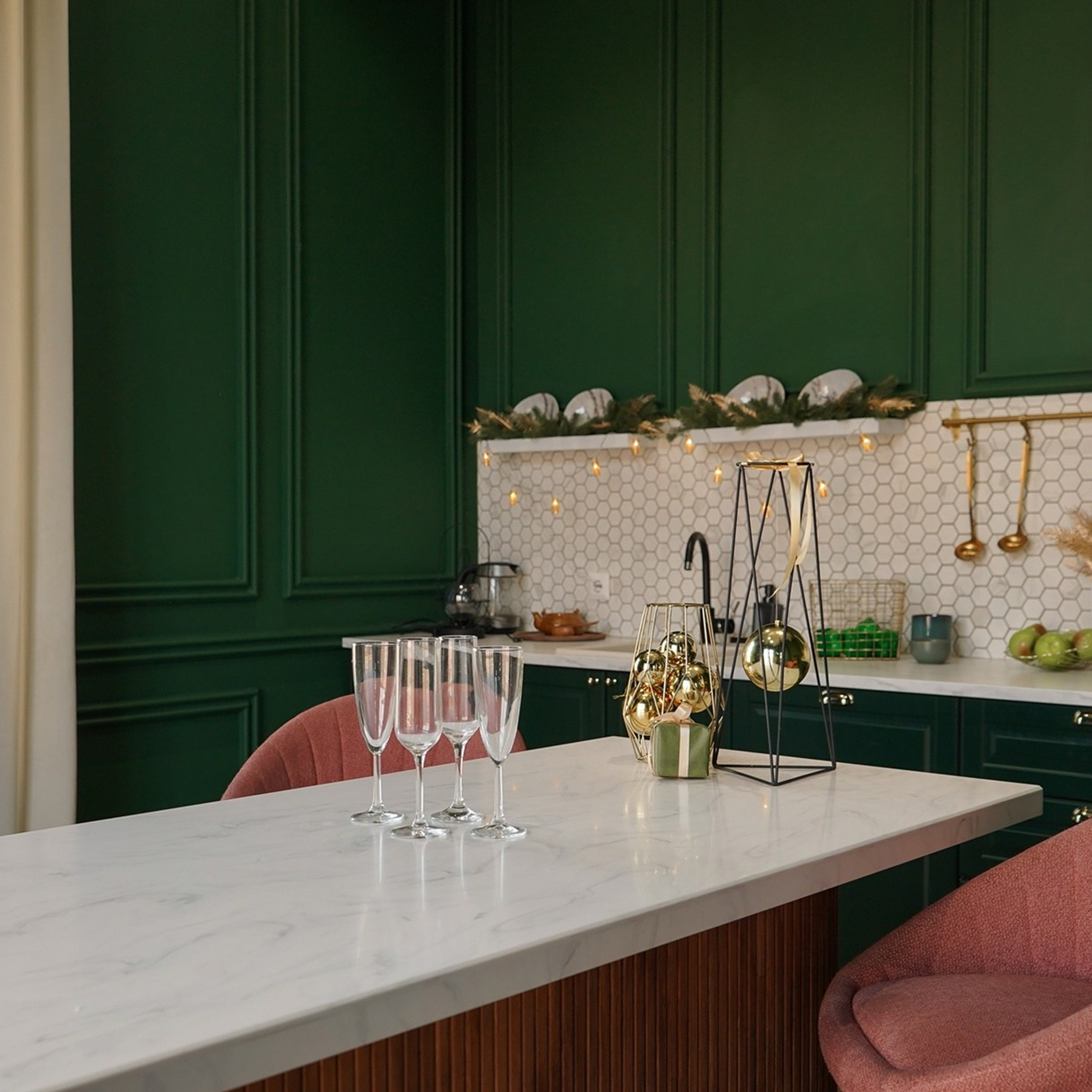Классическая классика, салон 19 века в новогоднее время. Идеально пить чаек отставив пальчик в сторону. 2 зоны — более светлая и более темная, в едином стиле.