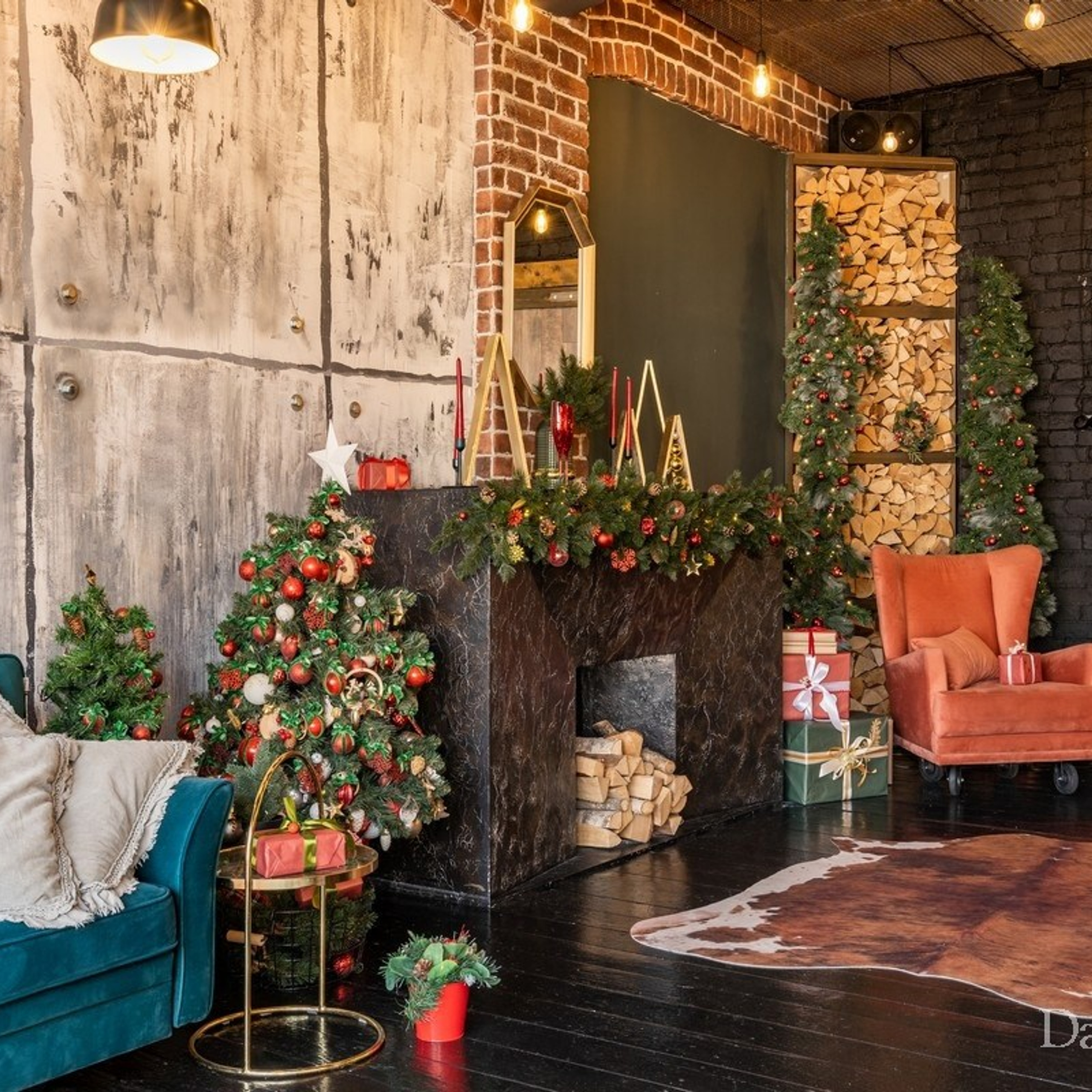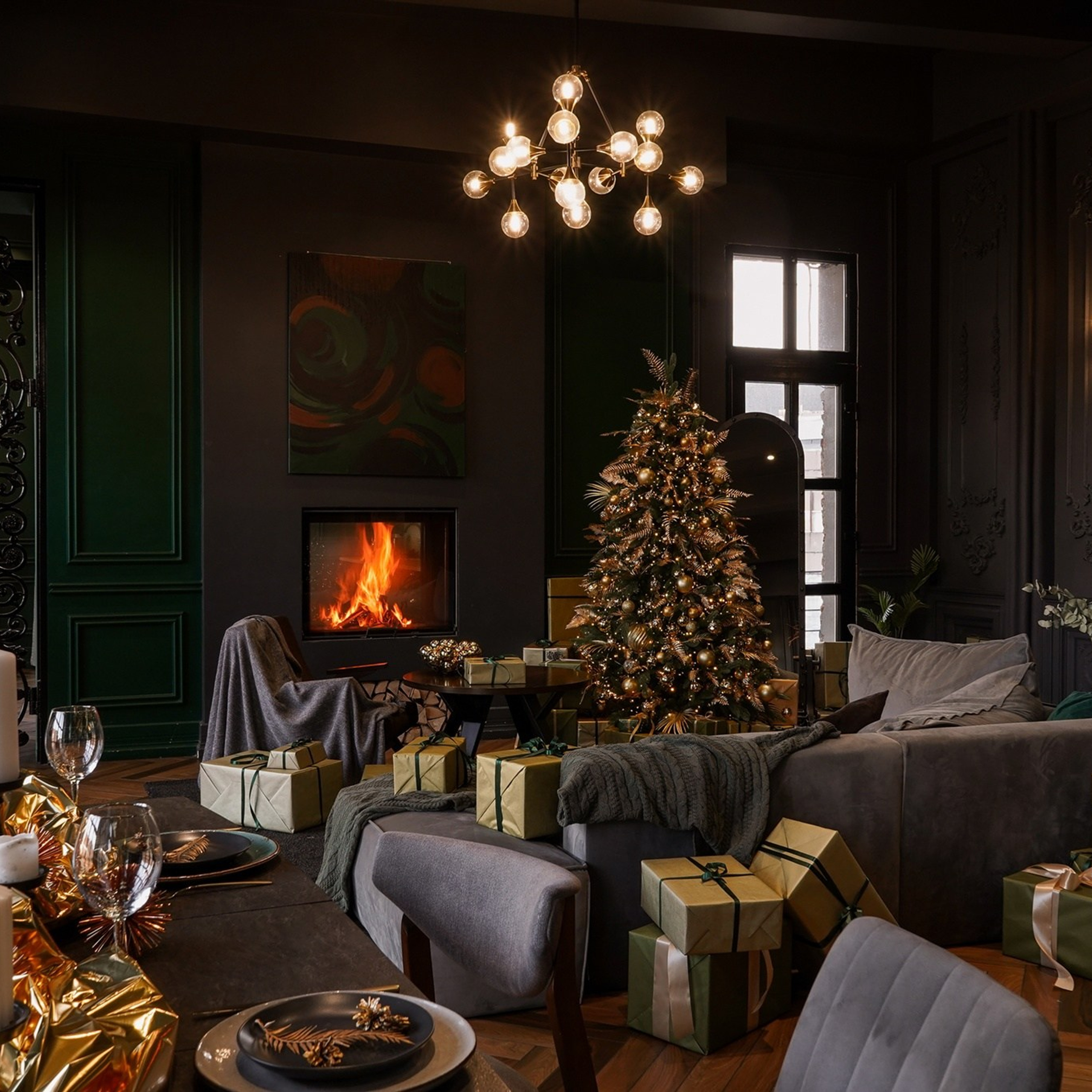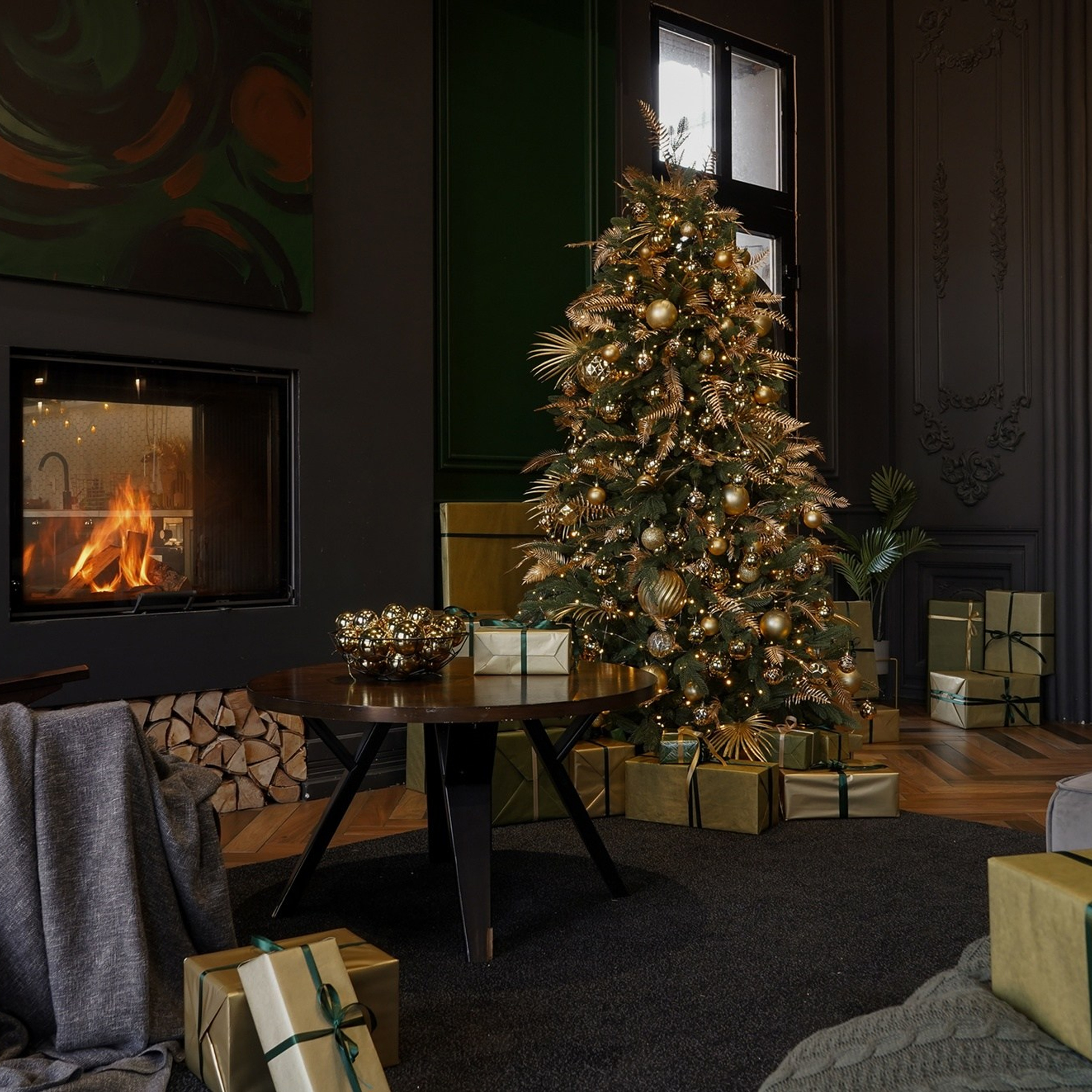 Зал в глубоких темных тонах. Камин, Елка с бордовыми шарами.