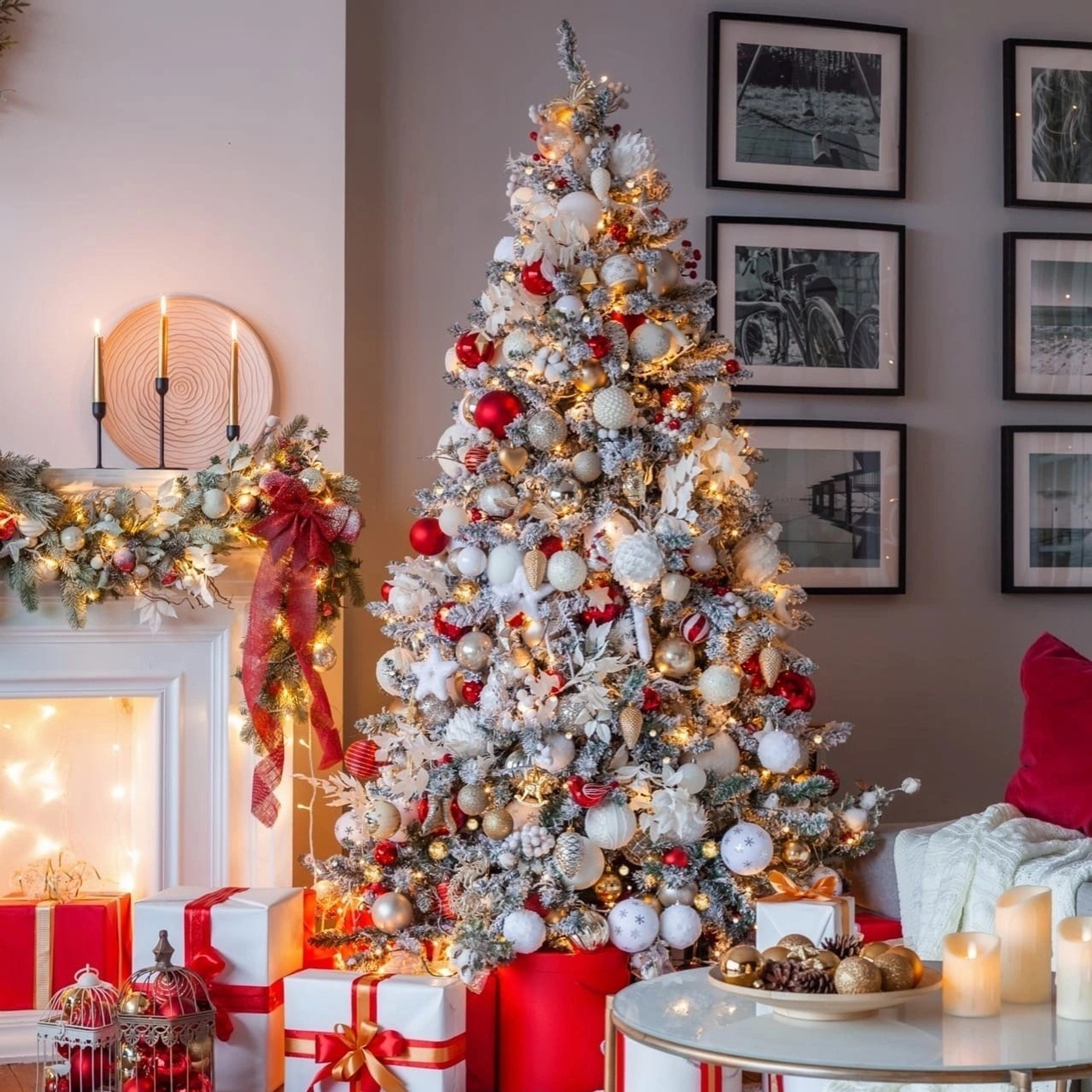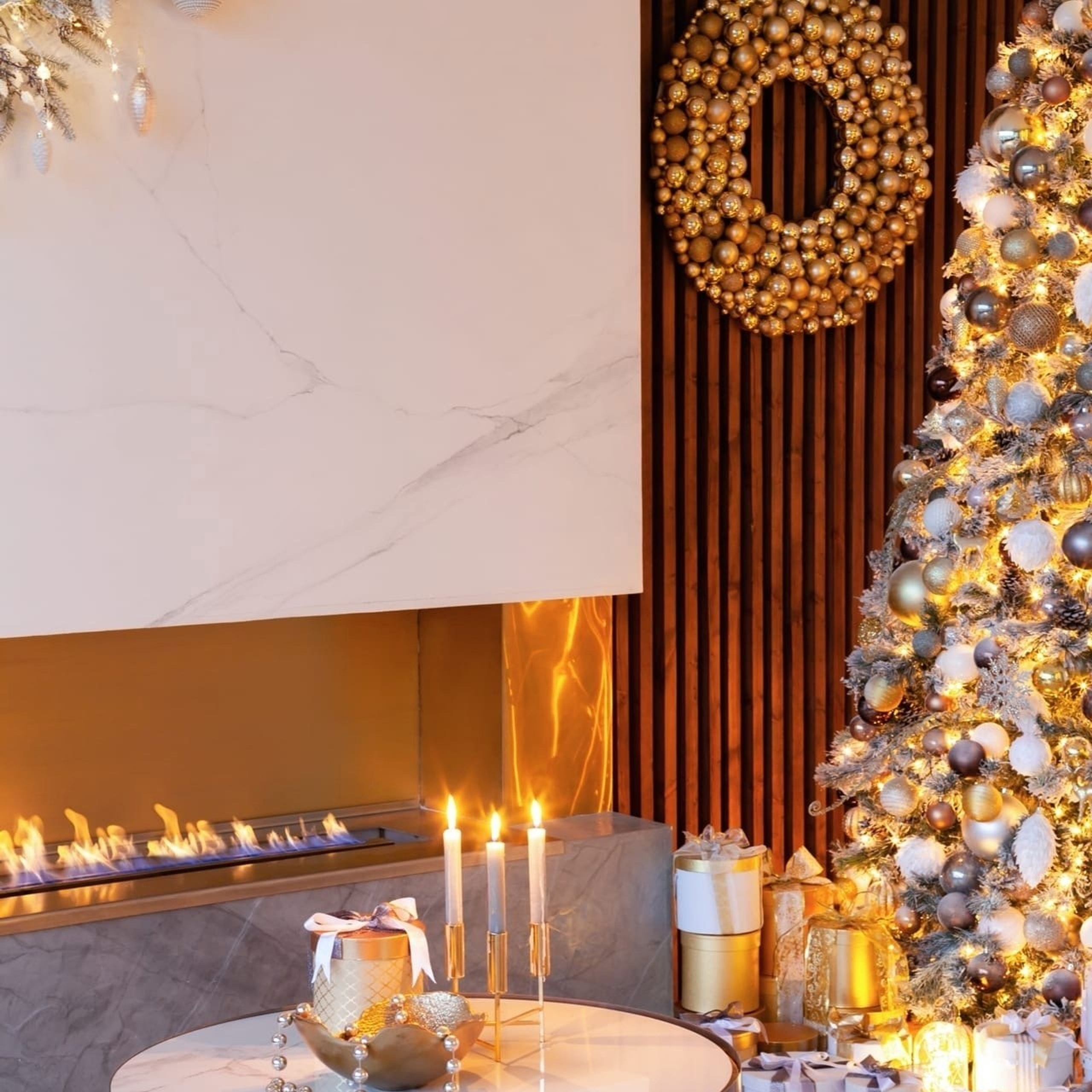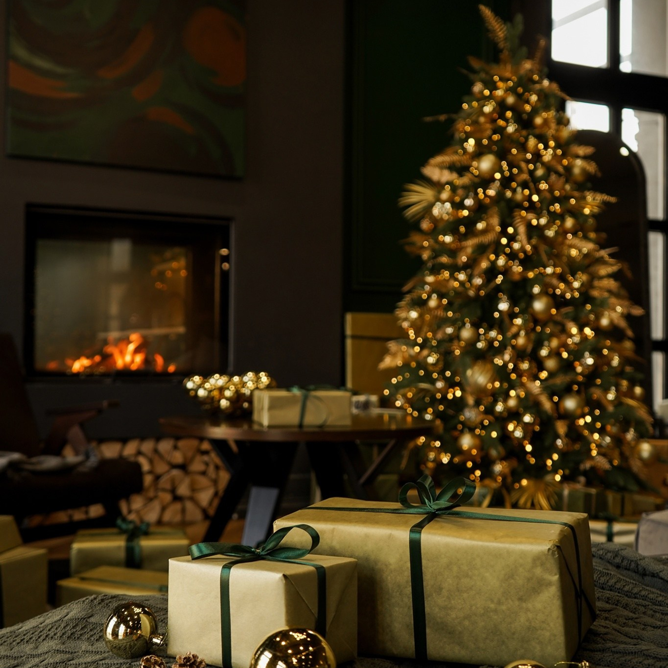Зал в глубоких темных тонах. Камин, Елка с бордовыми шарами.